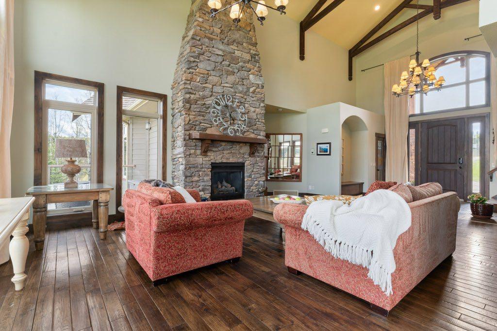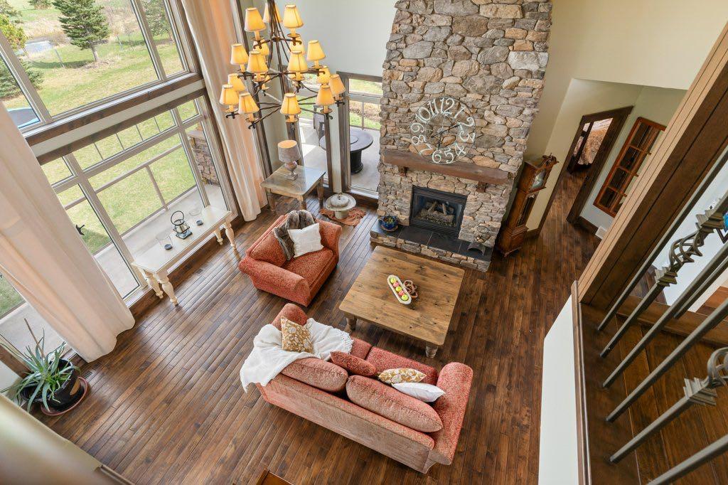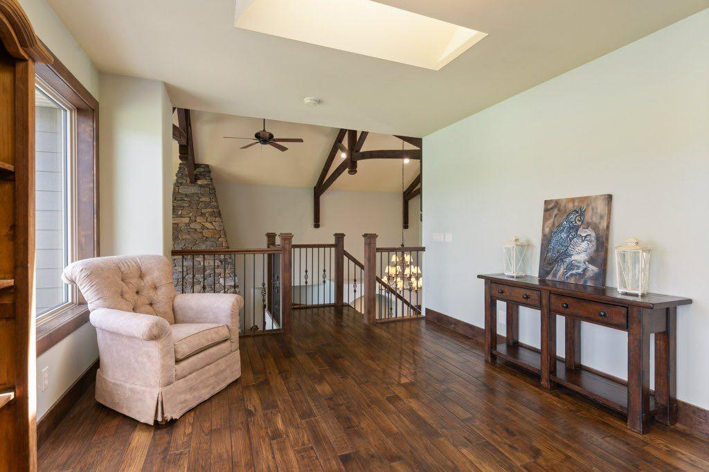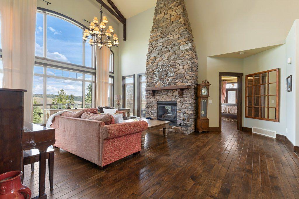 Step inside to discover soaring ceilings and hand-hewn hickory floors that create a warm, inviting atmosphere throughout the main level. The open concept living space is anchored by one of four magnificent fireplaces found throughout the home, providing both ambiance and comfort. Expansive windows and strategically placed skylights bathe the interior with natural light while framing picturesque views of the surrounding countryside.