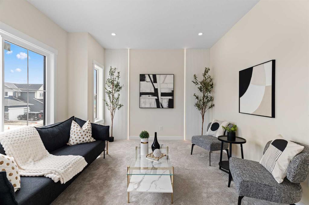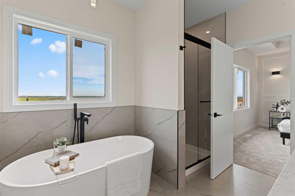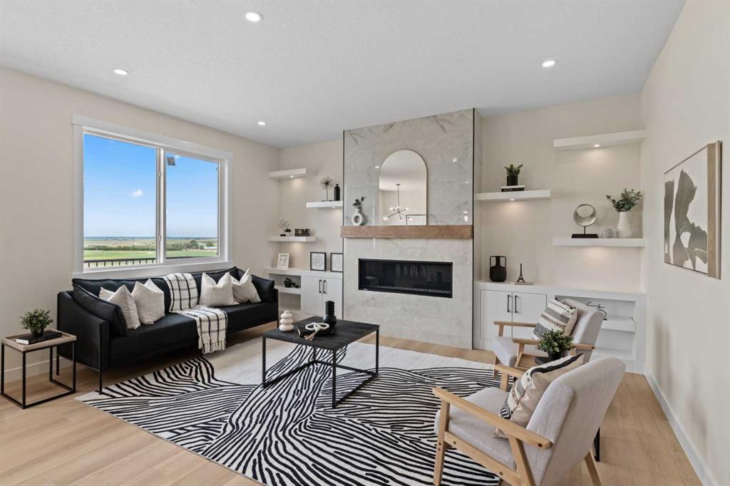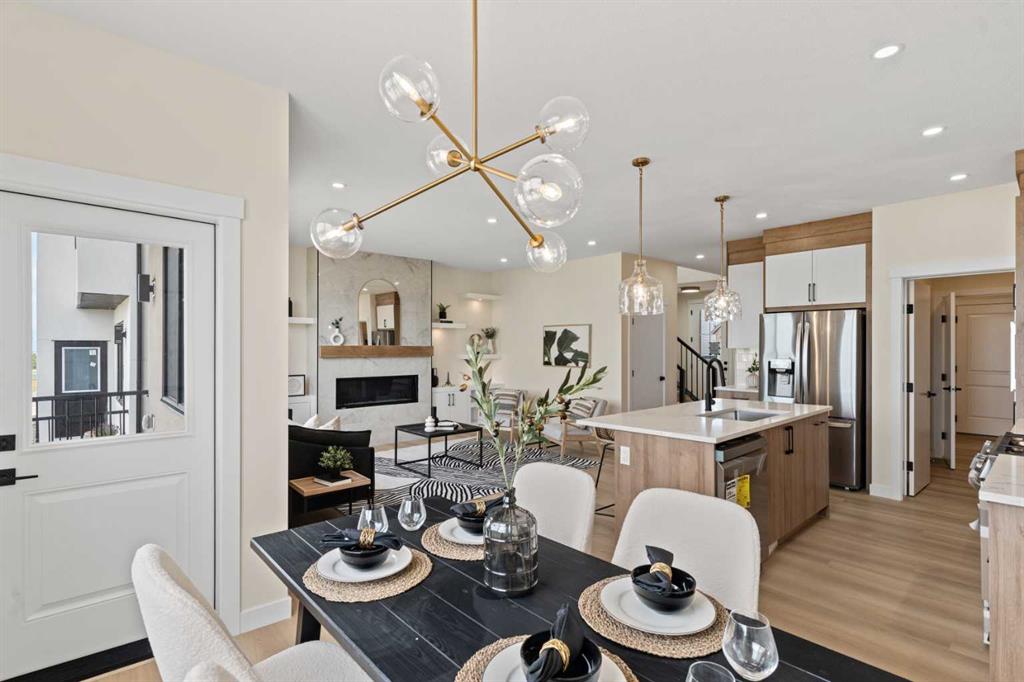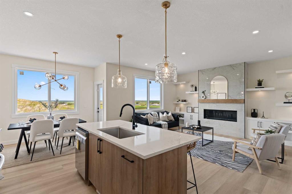 Welcome to our latest Exquisite SHOWHOME in the town of Crossfield. Just 10 minutes north of Airdrie, 25 minutes from Calgary and 3 minutes off highway 2. This 2050sqft heavily upgraded home consists of 3 bedrooms, 2.5 bathrooms with bespoke finishings such as maple wood detail, shaker with plywood cabinet boxes, black exterior dual pane windows, high end lighting, montigo natural gas fireplace feature, quartz countertops, upgraded black plumbing fixtures with freestanding tub, upgraded black hardware, wide plank Lvp flooring with a drywalled/insulated garage. Exterior also includes beautiful stucco/stone finishes. Full finishes can be provided upon request. Additional features include a large WALKOUT lot, 9FT CEILINGS on all floors, Open concept design, separate entrance, completed landscaping, basement roughed in with plans included. Spend sunny afternoons in the towns parks and playgrounds such as Veterans peace park or checkout the Crossfield Farmers market, the annual demolition Derby, the Rodeo grounds. This rapidly growing town also has amenities such K-12 schools such as Crossfield elementary school and W.G. Murdoch School, which are just short walk away! Find your forever home in this beautiful serene town with connectivity and affordable prices, you'll wonder why you didn't move sooner! Home is almost complete with final finishes/touchups and exterior landscaping remaining.
