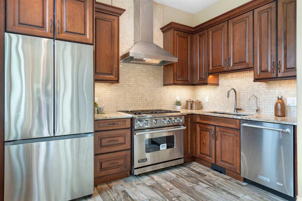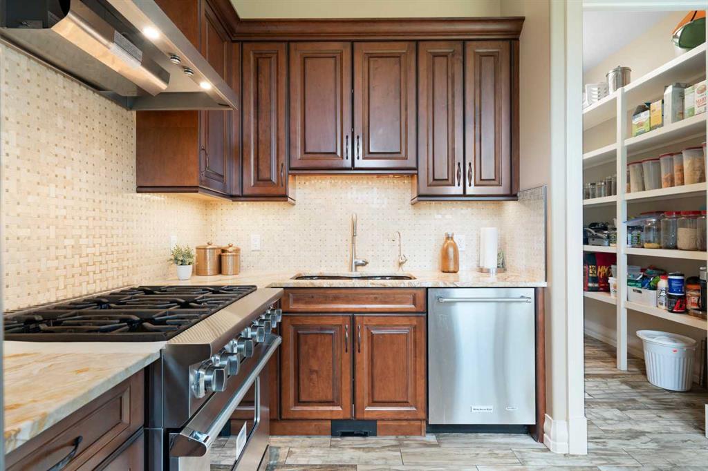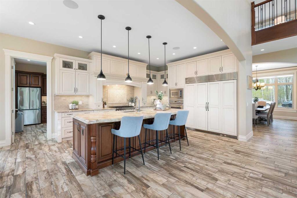 The kitchen is large and bright and has all the top end appliances you'd expect with high ceilings, a massive island and well finished cabinet work complete with a paneled fridge & freezer. The breakfast nook is surrounded with glass and views to the yard. Don't miss the entirely separate SPICE KITCHEN for chefs or food prep - right off of the large WALK THRU PANTRY. Additional main floor highlights include a refined private office, a practical mudroom, gorgeous open but formal dining room - all culminating under the 20 ft coffered ceiling main space with 2 storey window wall and floor to ceiling real stone fireplace.