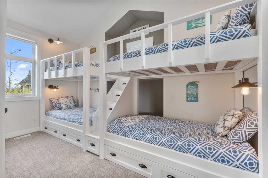 Upstairs, you’ll find a cozy bunk room that sleeps four, perfect for kids or guests, alongside the primary bedroom and a 3-piece bathroom. The fully finished basement extends your living space with a generous recreation room and hosts the laundry area, offering both comfort and practicality. The magic continues outdoors where a wraparound deck invites you to host unforgettable gatherings under the stars. Lounge by the second wood-burning fireplace, unwind in the inflatable hot tub, or simply soak in the peaceful surroundings of this dark sky community. A separate carriage house offers even more flexibility, featuring its own coffee bar, queen sized bunk beds, and another 3-piece bathroom – perfect for hosting extended family, guests, or creating a private retreat space. As part of this exclusive lakeside community, you’ll enjoy unmatched amenities including lake access, an indoor pool, hot tub, tennis courts, fitness facility, community dock, kitchen, and beach volleyball courts – all set against the stunning backdrop of the Rocky Mountains.