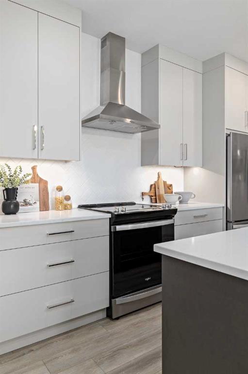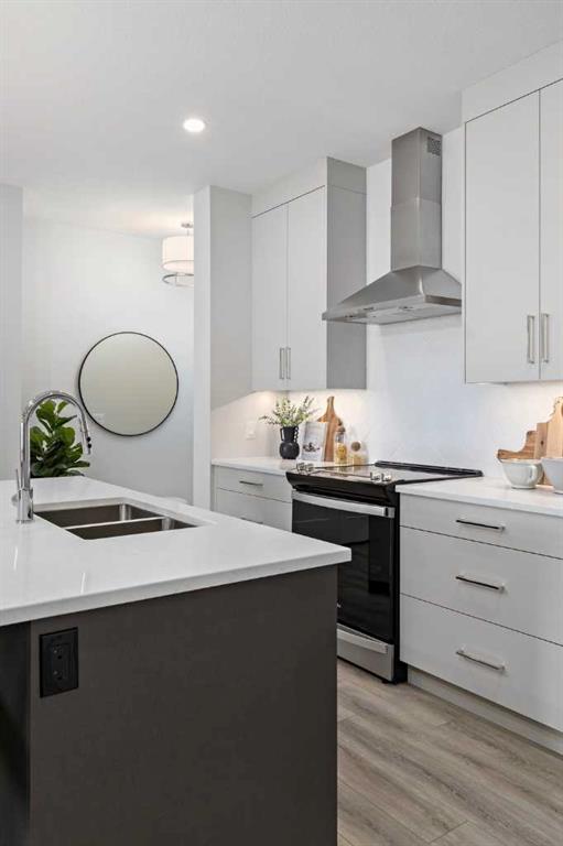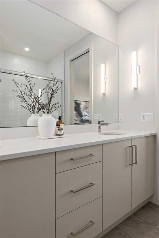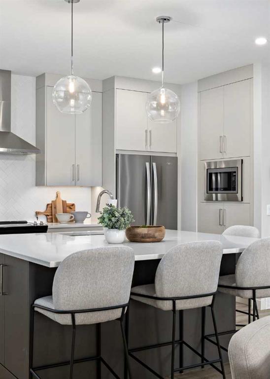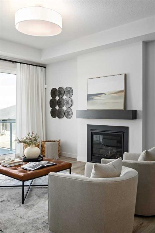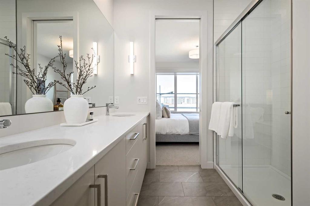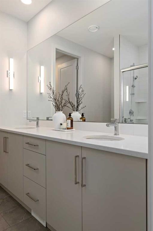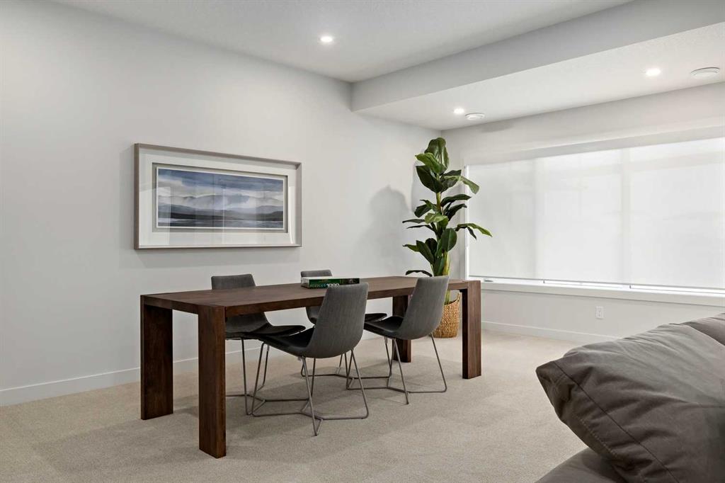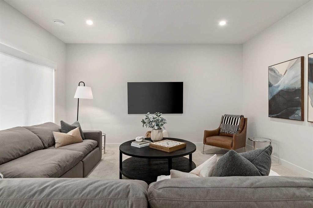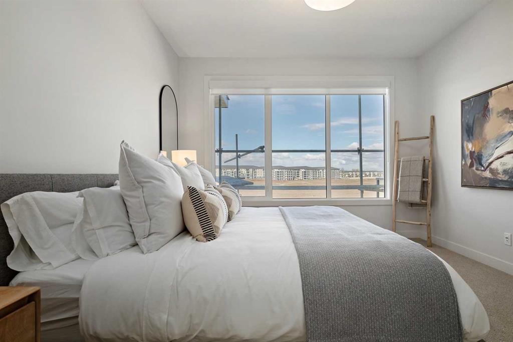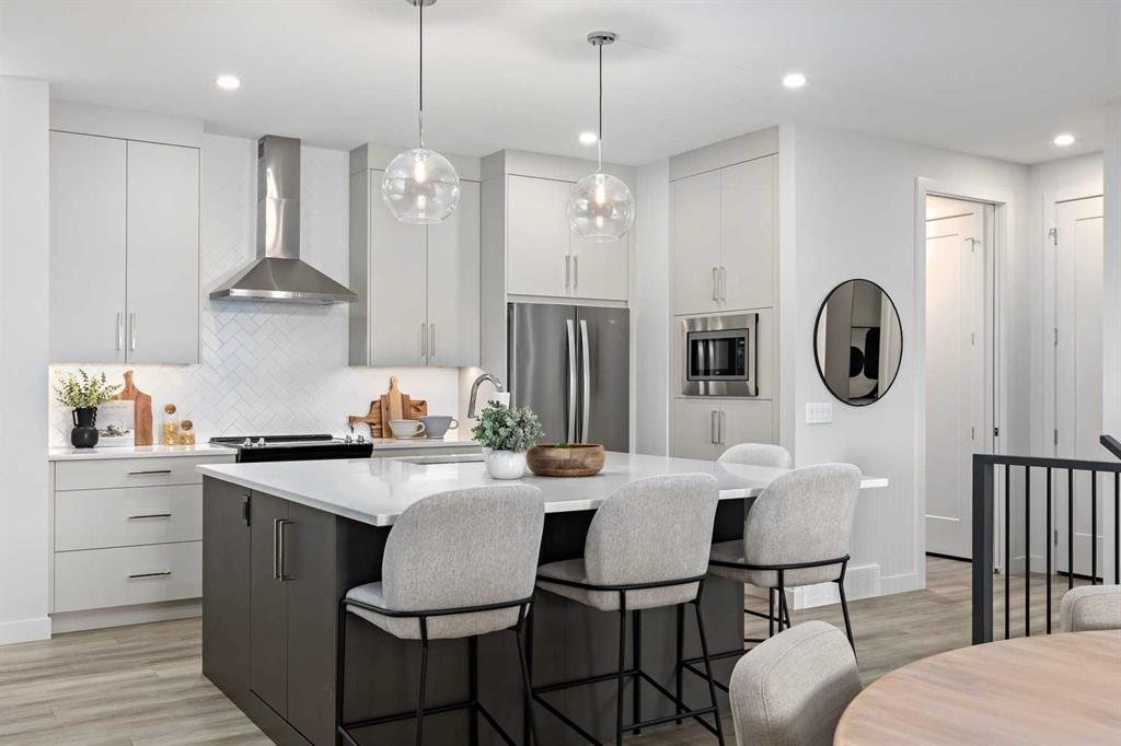 SHOW HOME now available - The Grove at Sage Meadows. This villa is part of an exclusive collection of just 27 homes nestled along the tranquil WEST NOSE CREEK. Combining natural beauty with everyday convenience, The Grove offers immediate access to Stoney Trail and nearby amenities. This show home includes a FINISHED DOUBLE GARAGE, CENTRAL AIR CONDITIONING, CUSTOM WINDOW COVERINGS, a HERRINGBONE TILE BACKSPLASH, and a WOOD MANTLE above the fireplace. Built by Lupi Luxury Homes, this home features luxury vinyl plank flooring, quartz countertops, sleek Zonavita cabinetry, whirlpool stainless steel appliances, designer lighting, custom closet systems, triple-pane windows, and a high-efficiency furnace. The 1,212 SQ. FT. main level offers a well-planned layout with a generous kitchen island with seating for four, an open dining area, a bright great room, and a private primary suite with a double vanity ensuite and walk-in closet. The 995 SQ. FT. WALK-OUT BASEMENT includes two bedrooms, a full bathroom, and a flexible recreation space that opens onto a covered patio. Please note: all RMS measurements are based on builder blueprints. Furniture is not included in the list price but may be purchased at an additional cost.