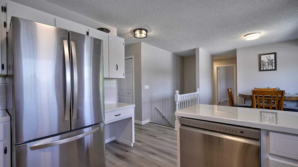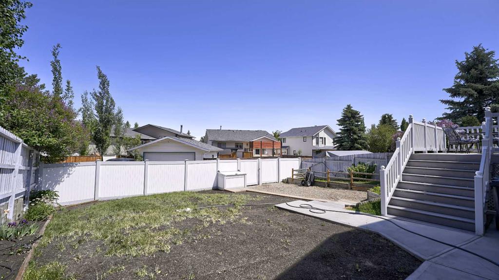 Very welcoming front porch here, with maintenance free decking. Inside is very cozy, with large living room at the front, plus an eye catching brick fireplace. Dining room is a great space for entertaining, with opening windows. Kitchen is a chefs dream with tons of counter space, an abundance of cupboards, and gleaming new stainless steel appliances. Nook is cozy for your morning breakfast. Great outdoor space, with maintenance free decking, railing & fence. Sidewalk in the back has been just been poured. Grass is just seeded and doing good! Room to park your RV in this back yard. Convenient main floor Laundry, with cabinetry & laundry machines raised for easy access. Main floor bathroom has been recently renovated. Primary bedroom has a good sized window, plus ensuite w/brand new stand up shower. This double attached garage is heated, drywalled & insulated, with convenient man door to the yard. Hot water tank is less than one year old. Kitchen appl, excl stove, are new. New laminate flooring on the main… So many new upgrades here! Furnace has been serviced yearly. Location is ideal, walking distance to Crossfield elementary school and the high school. Walk to the arena and community hall. Walking distance to skate park, Ball diamonds and McCaskill Park.