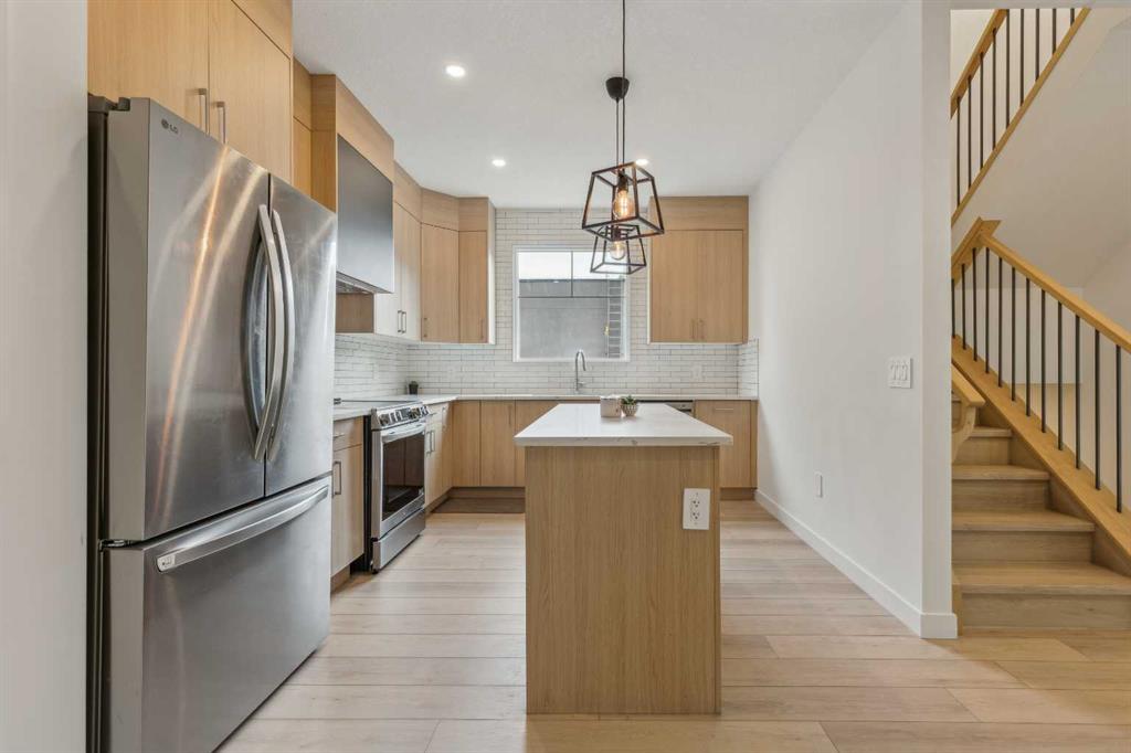 On the main floor, the bright, open-concept layout is ideal for entertaining or relaxing. The kitchen is a true highlight, featuring ceiling-height custom cabinetry, sleek quartz countertops, designer tile backsplash, a central island with bar seating, built-in pantry, and a premium stainless steel appliance package. A cozy dining area easily fits a 4-6 person table, while the spacious living room offers a gas fireplace, large window, and stylish feature wall for the perfect ambiance.