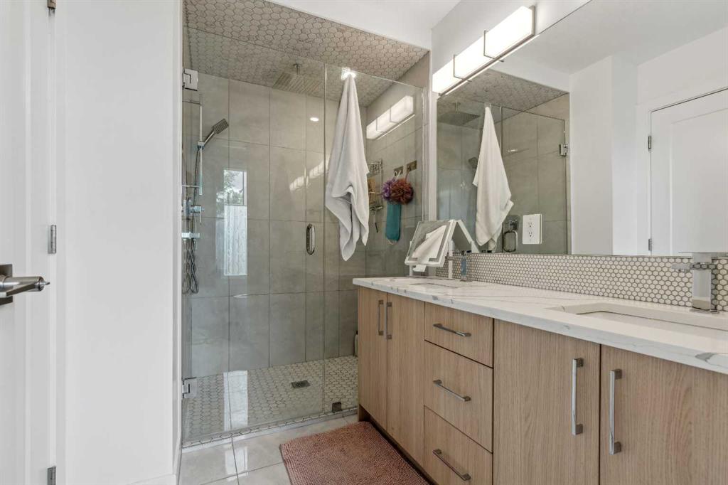 Upstairs, you’ll find two generously sized bedrooms, each with its own private ensuite. The primary suite includes a walk-in closet with custom shelving and a 4-piece ensuite with dual sinks and a tiled walk-in shower. The second bedroom features walk-in closet and a 4-piece bathroom with a tub/shower combo. A convenient laundry area and linen closet complete this level.