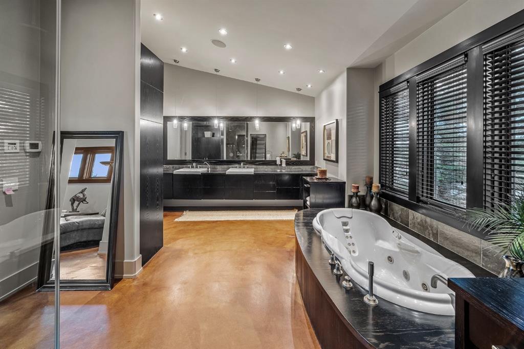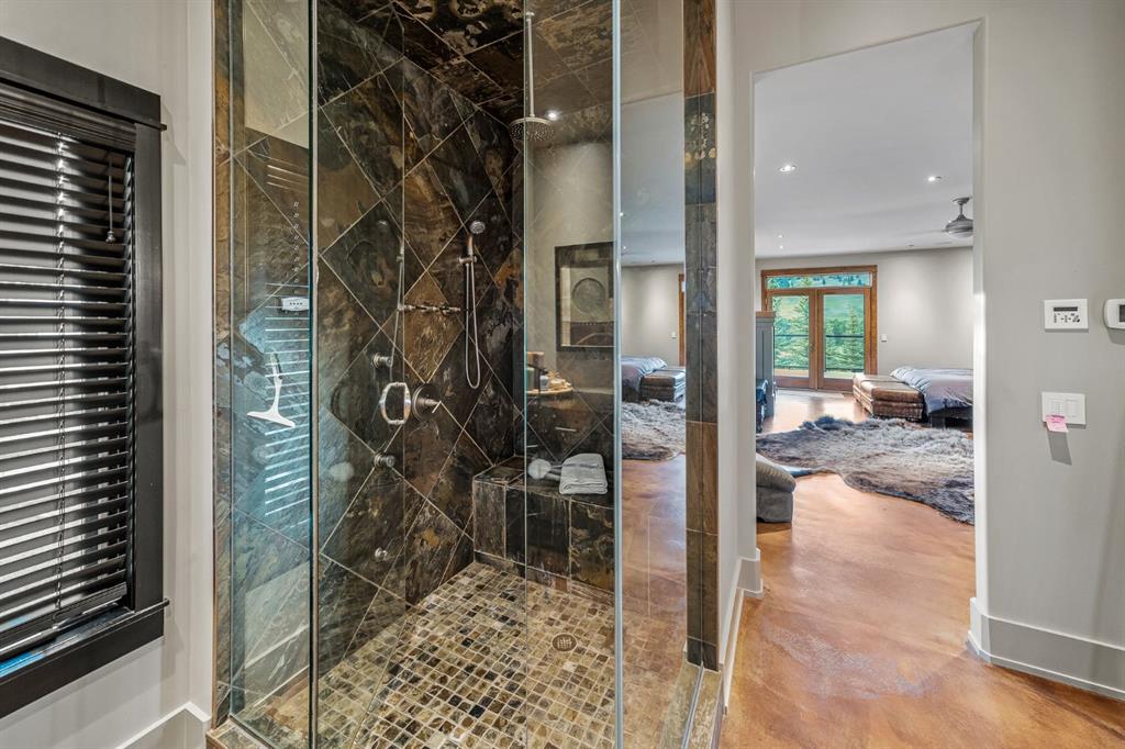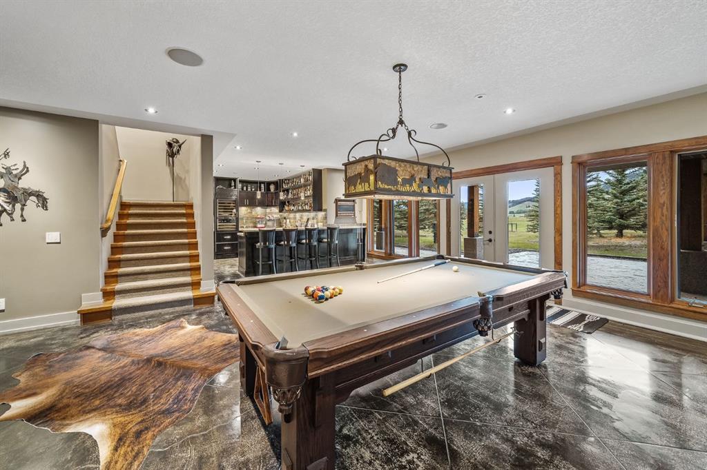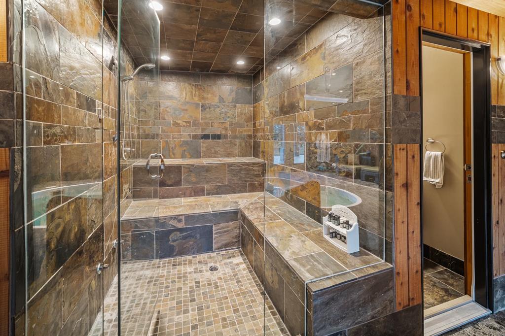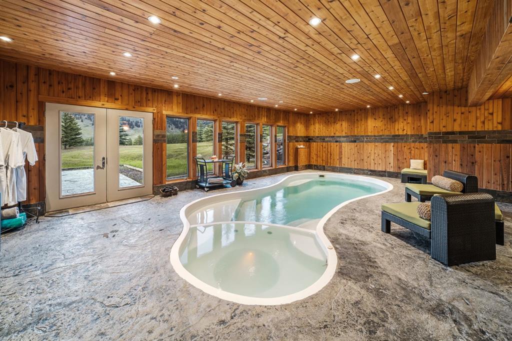 The fully developed walkout level is designed for elevated entertaining, featuring a full bar, games area, theatre with a starlit ceiling, two guest bedrooms, and a third laundry space. A dedicated dog wash and mudroom add practicality, while the cedar-clad indoor pool room is the ultimate in-home spa—complete with swim jets, a recessed hot tub, steam room, shower, and ambient LED lighting.