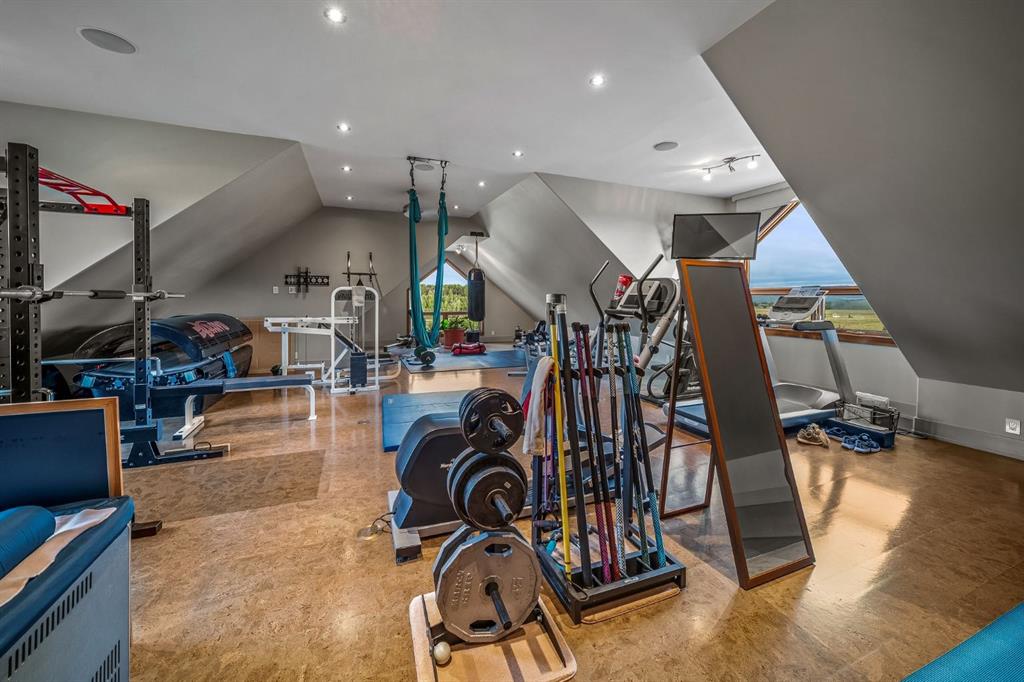 Thoughtful functionality continues with a tech station, walk-in pantry, oversized mudroom, and laundry zone off the quadruple attached garage. Above the garage, a 1,064 sq. ft. flex space—currently a gym—boasts cork flooring and unobstructed views of the Rocky Mountains.