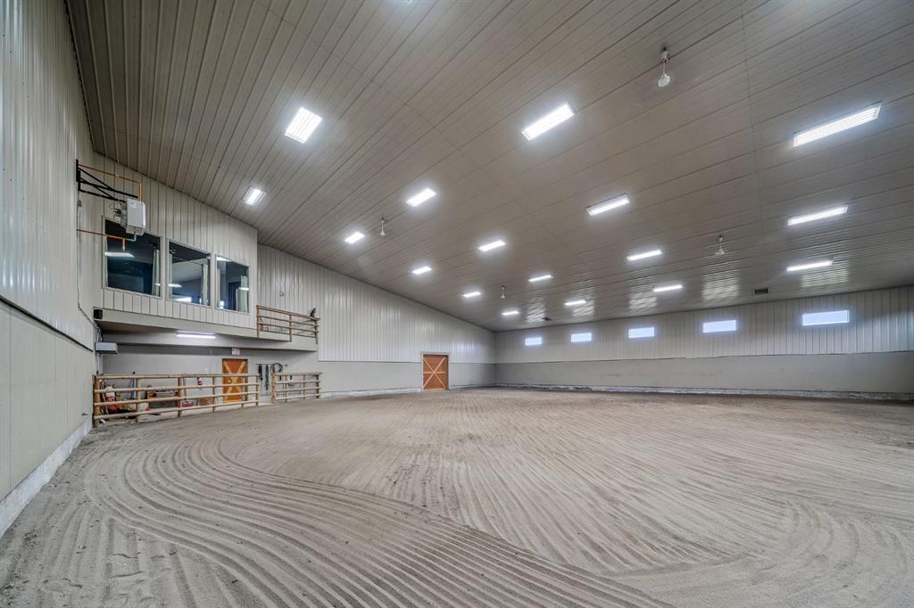 Beyond the main home, the second structure elevates this property into a true luxury compound. It includes a 45’ x 39’ heated workshop, a custom six-stall barn with Dutch doors, and a 78’ x 78’ indoor riding arena with a mezzanine viewing deck. Above it, the bespoke Saloon offers the perfect venue for private gatherings with a fireplace, wet bar, wine fridge, full bath, and stunning arena views.