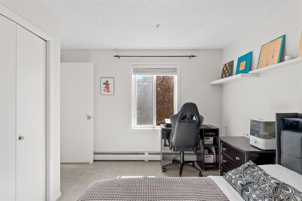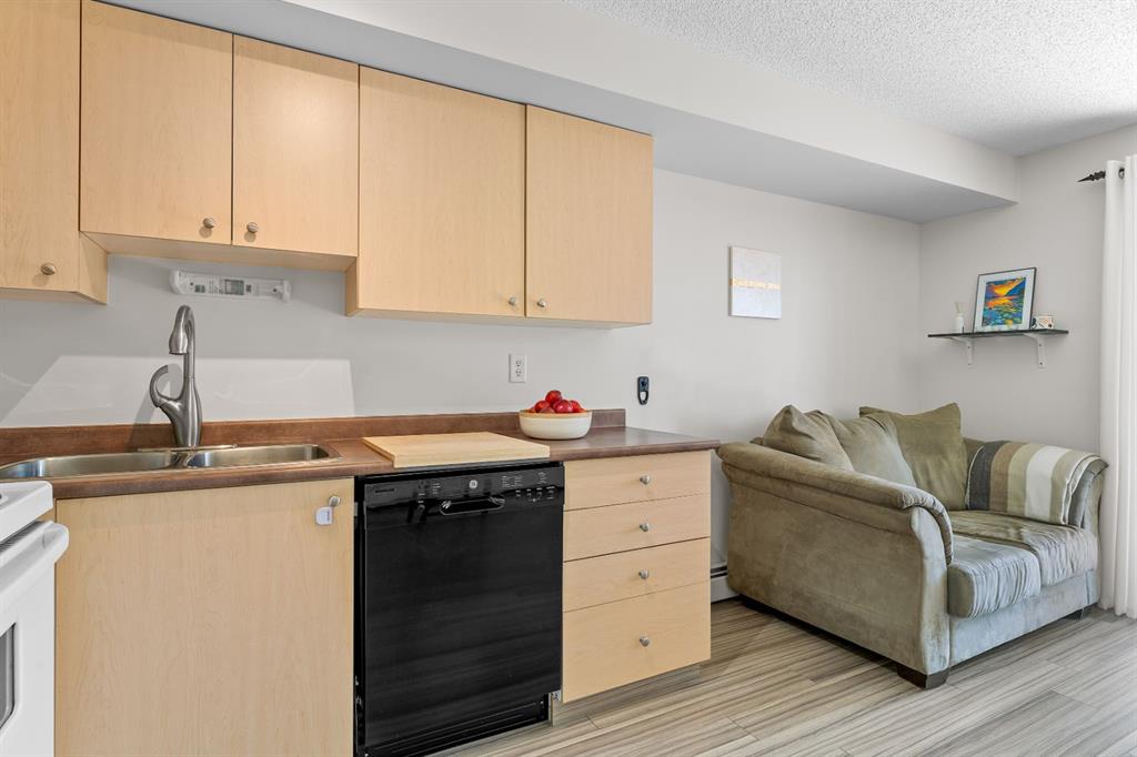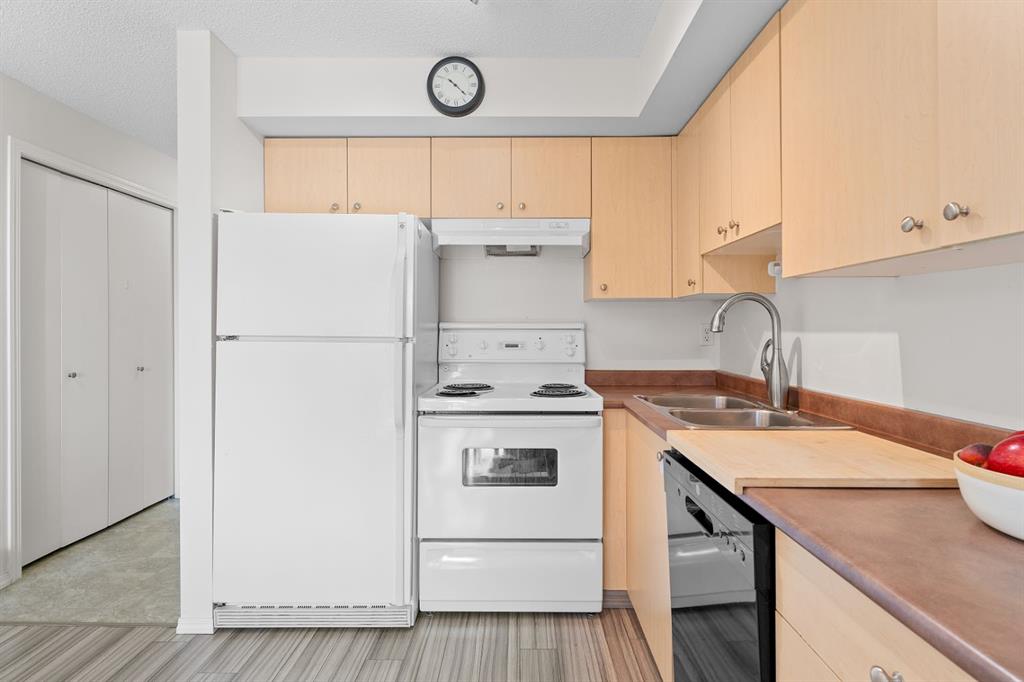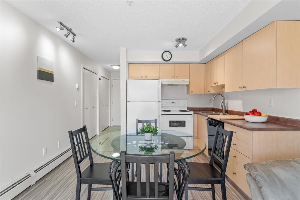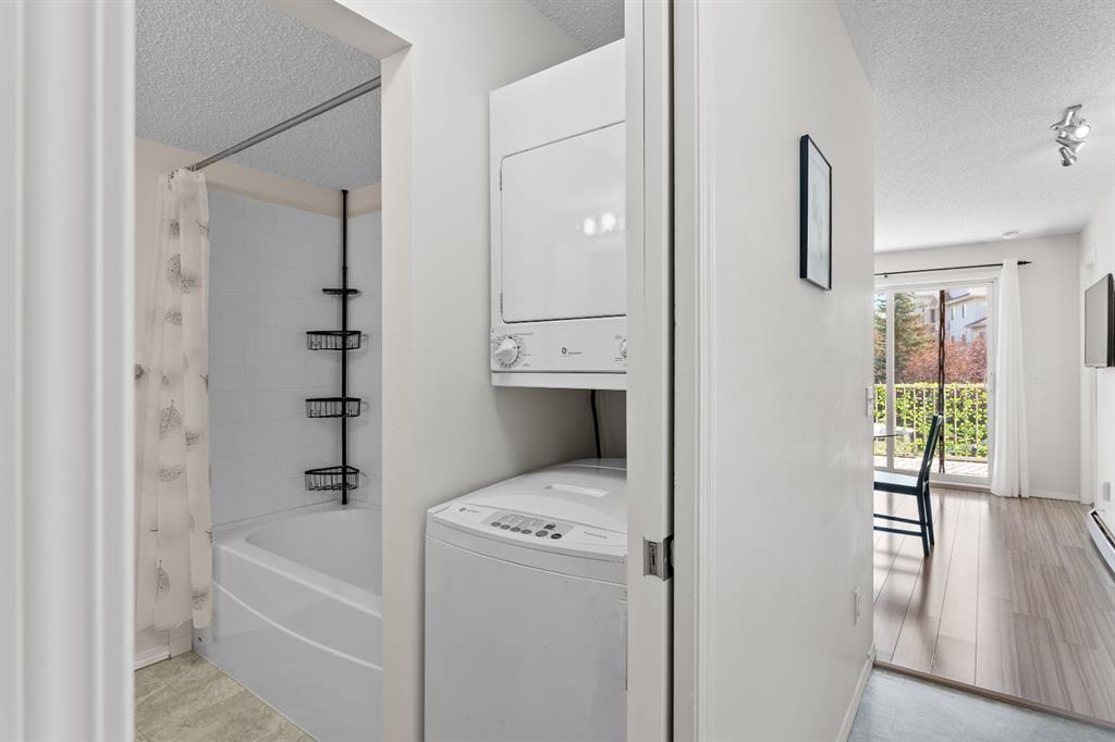 Step inside to find a spacious bedroom featuring his and hers closets, leading into a well-appointed 4-piece bathroom. The functional kitchen provides ample cabinet space, and the open-concept layout allows for seamless flow into the living and dining areas. Enjoy the added convenience of in-suite laundry and a titled underground parking stall for year-round comfort.