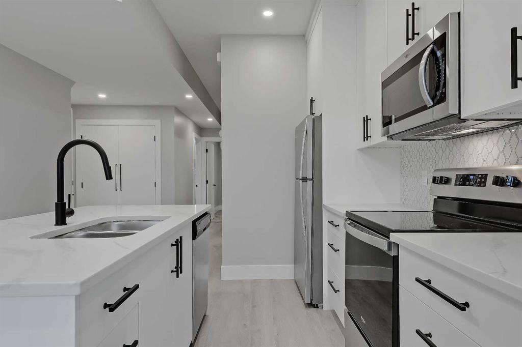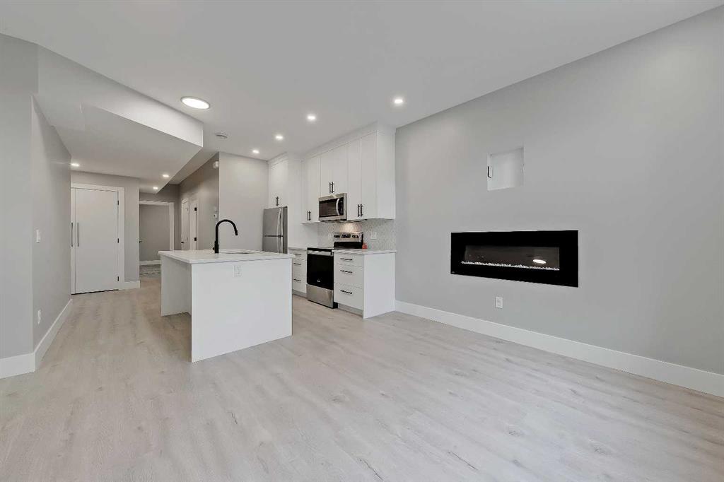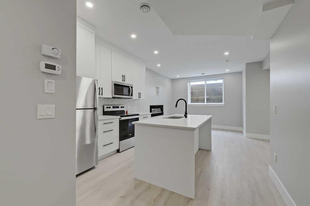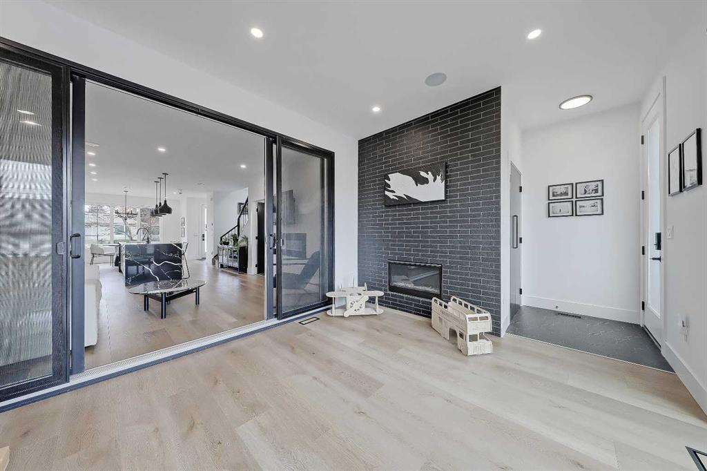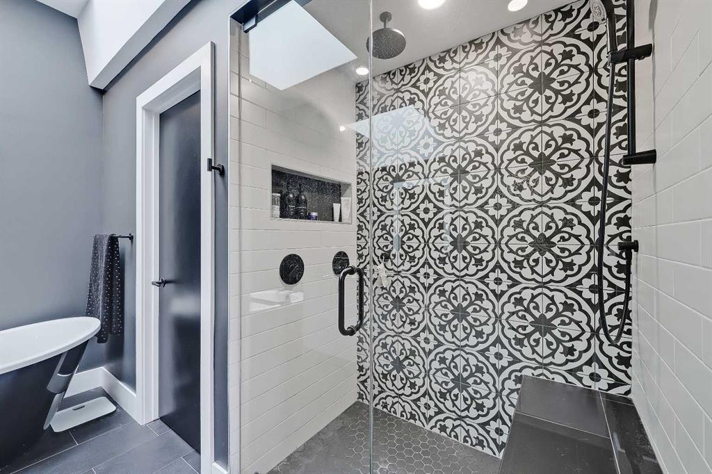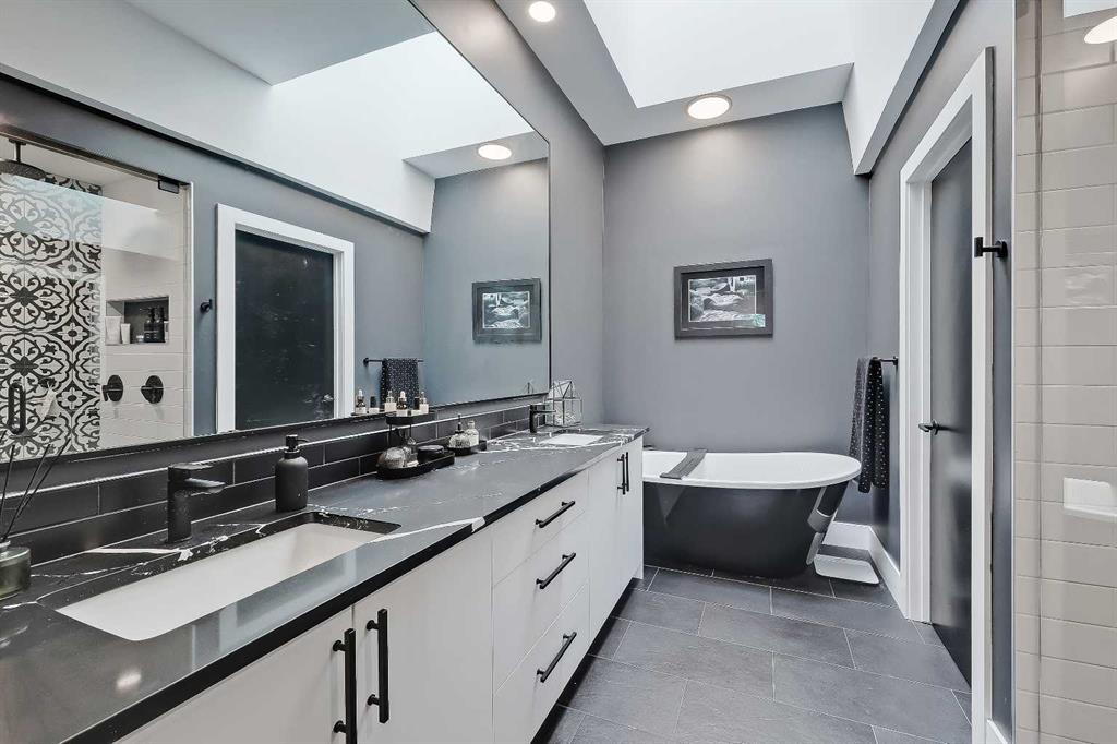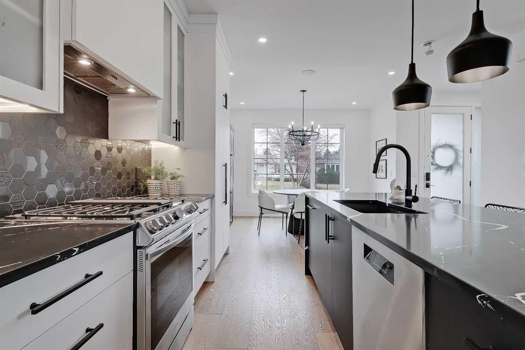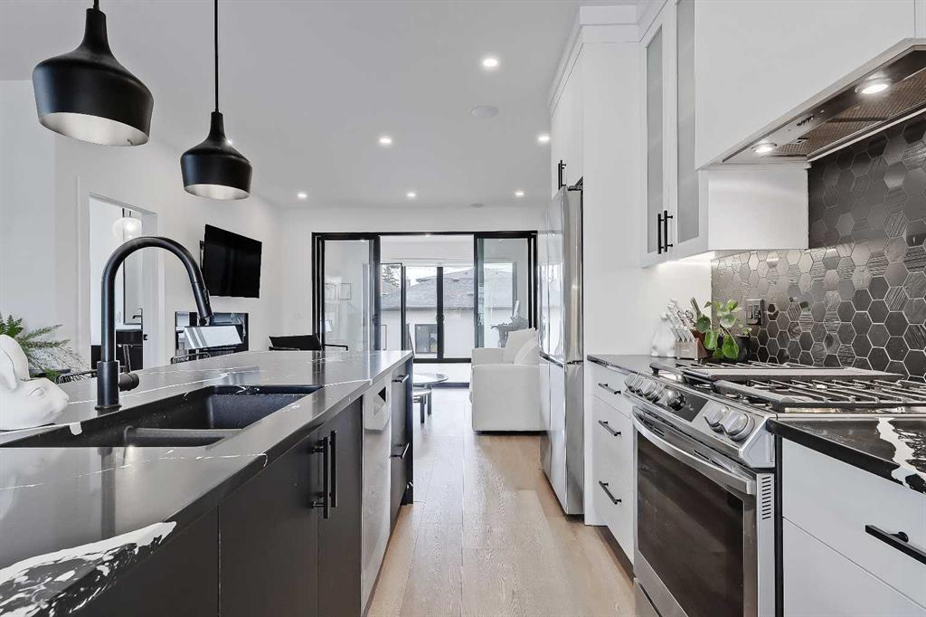 THIS IS NOT YOUR TYPICAL INFILL – this custom-designed home features hand-selected interior finishings and numerous upgrades throughout, including a LEGAL 2-BED BASEMENT SUITE with fully private separate entrance. Features are literally too numerous to list and must be seen to be appreciated, including not one but FOUR fireplaces, an EV-ready garage, multiple skylights, feature walls and custom tilework, custom built-ins, engineered hardwood and LVP flooring, central AC, electronic blinds and much more. Featuring a showstopping high-contrast black and white interior design, this exceptional infill home was meticulously designed to combine style with function and is in excellent condition throughout. The open-concept main floor features soaring 9-ft ceilings, wide-plank engineered hardwood flooring, and enormous windows throughout. A stunning designer kitchen boasts an enormous central island with quartz waterwall countertops and bar seating for four, perfect for entertaining. Ceiling-height flat panel cabinetry with frosted glass features, under-cabinet lighting, and an upgraded appliance package including a gas stove with griddle and French door fridge/freezer. On either side of the kitchen are a spacious front dining area and cozy living room with wide-format fireplace. A TOTALLY UNIQUE design includes a SEPARATE REAR SOLARIUM at the rear of the home, PERFECT FOR A QUIET HOME OFFICE, second living room, or home-based business. Sliding glass doors here from the main living space allow for natural light to flow while noise transfer from the rest of the house is kept to a minimum. Upstairs, 3 spacious bedrooms and 2 full baths reside, including the enormous primary suite with vaulted ceilings, walk-in closet with organizers, and private 5-piece ensuite bath with barn door, free-standing soaker tub, oversized glass-enclosed shower, and oversized vanity with dual undermount sinks. The developed basement boasts a LEGAL 2-bedroom basement suite, fully self-contained with a private entrance and stairwell, boasting 9-ft ceilings and oversize windows, low-maintenance LVP flooring and separate laundry services. The smart floorplan includes an open-concept kitchen with ceiling-height cabinetry, stainless steel appliances, quartz counters and an island with bar seating. Plus, there is room for both a living room AND a dining room – a rarity for lower-level suites. Outside, a fully fenced yard includes a concrete patio and greenspace, with quick access to the insulated and drywalled double garage. Located on a quiet residential street in Shaganappi, this fantastic infill home is just a 3-min walk to the West LRT, 6-min walk to the community centre with park and tennis courts, 10-min walk to Killarney pool, 9-min walk to Shaganappi golf, and a 5-min walk to 17 Ave with numerous restaurants and amenities. And, you are less than 10-min by car to the downtown business core!