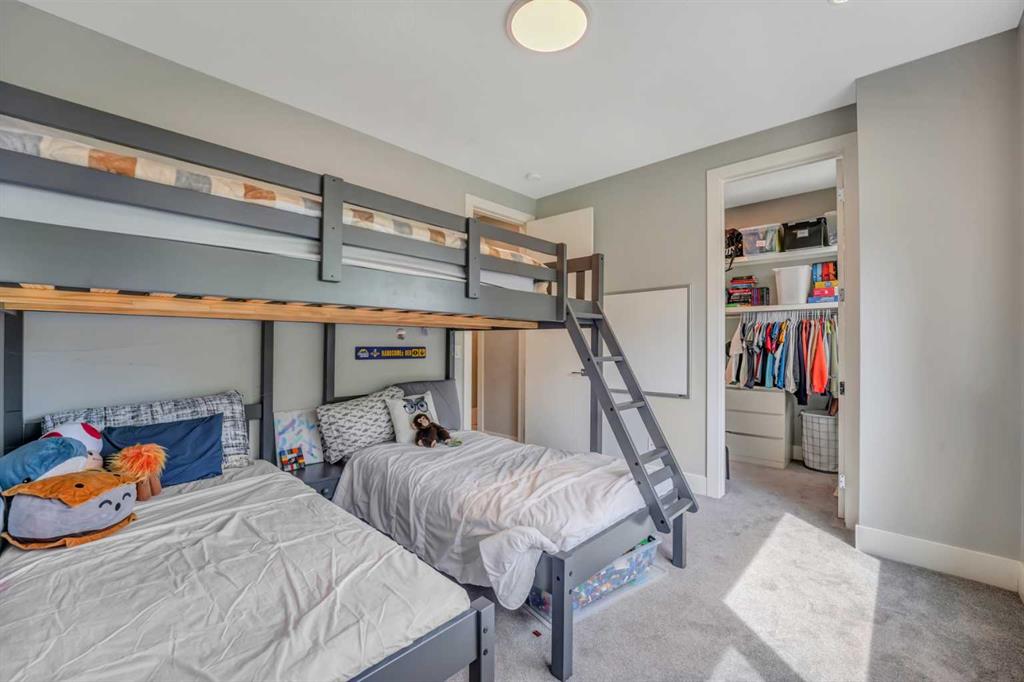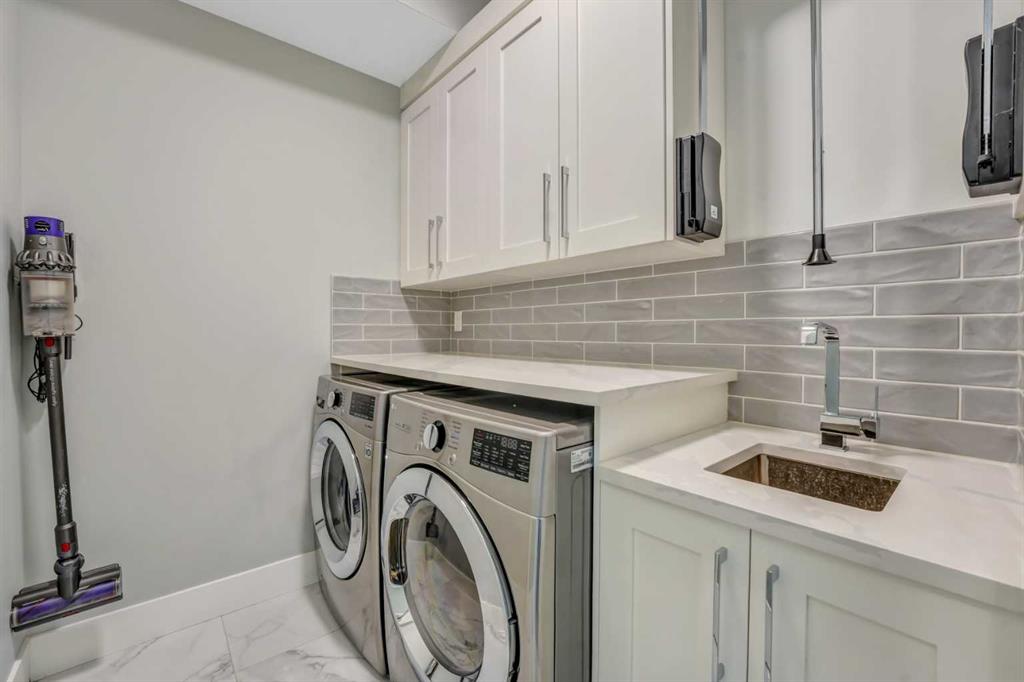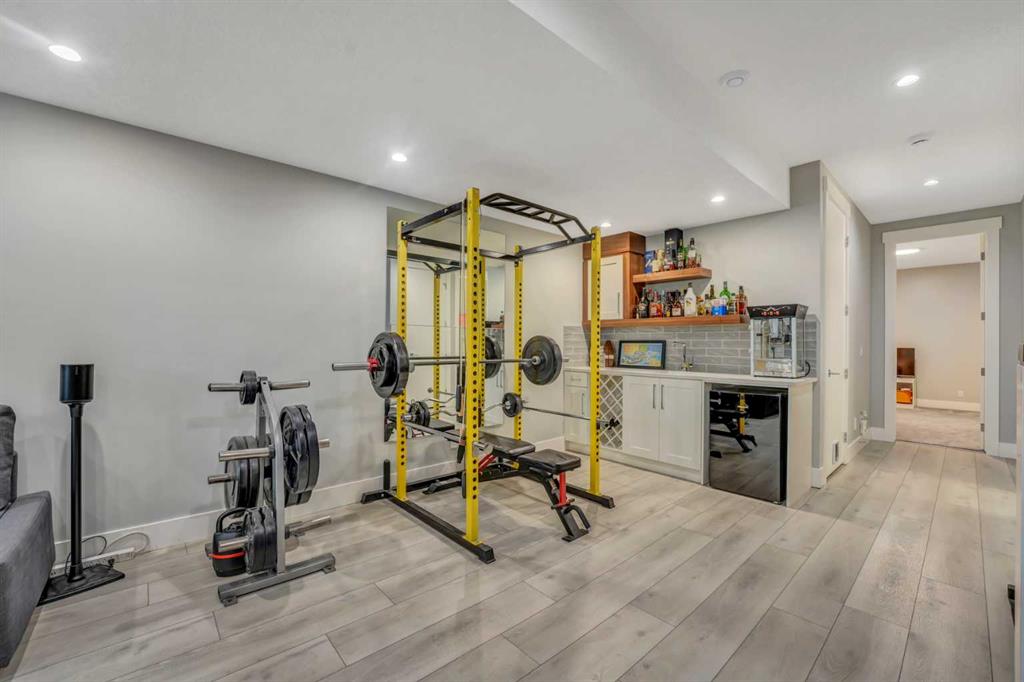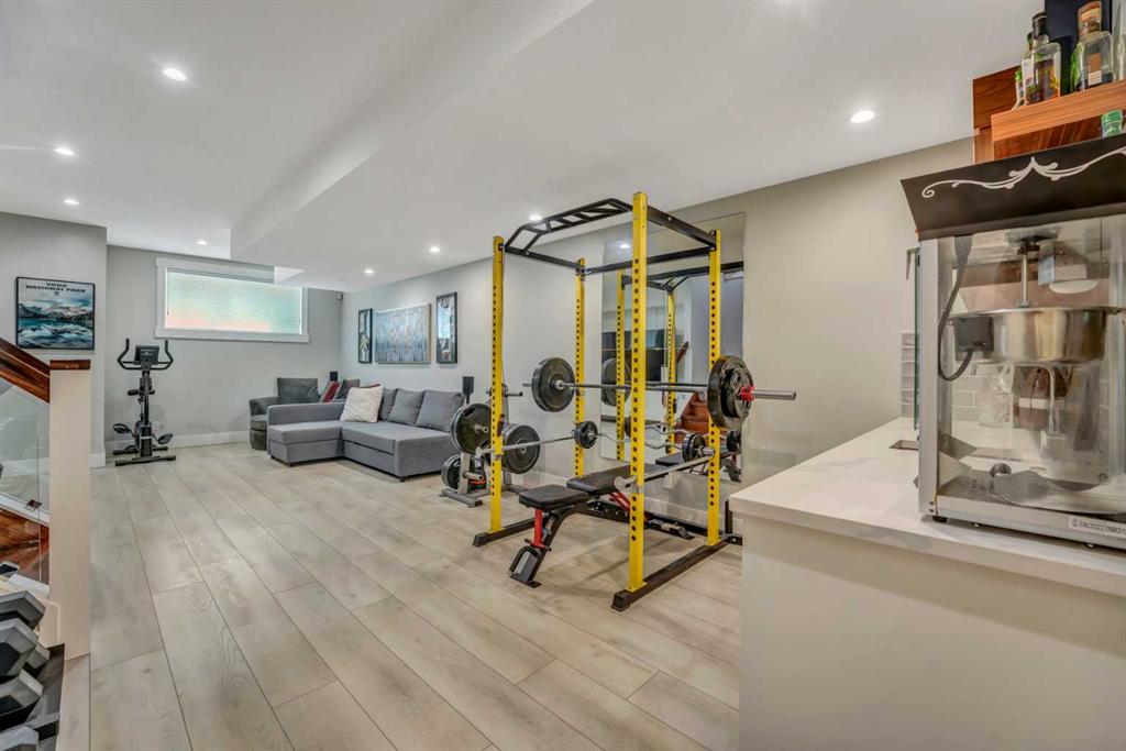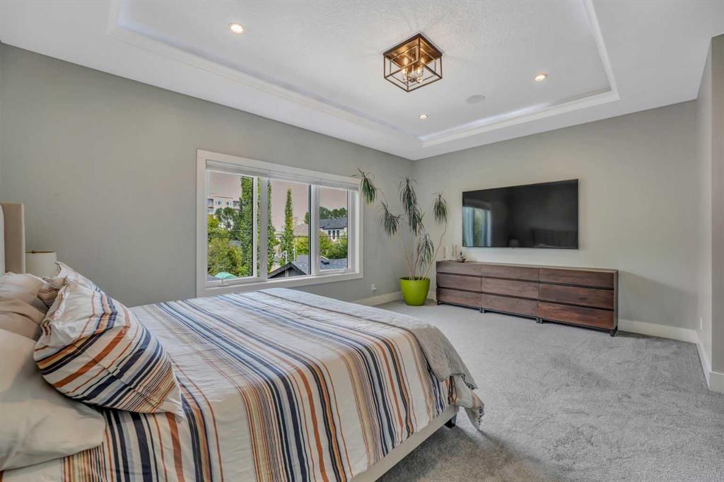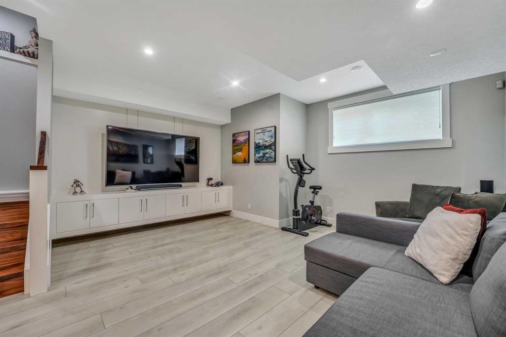 As you head upstairs you’ll immediately notice the high vaulted ceilings, 8ft doors, and abundance of natural light. The primary bedroom feels less like a bedroom and more like a retreat. It is a true sanctuary, easily accommodating a king-sized bed and nightstands, plus a separate sitting area, recessed lighted ceiling, large walk-in closet with built-ins, and a spa-style 5-piece ensuite with dual sinks, jetted tub, and oversized 10mm glass shower (roughed-in for steam). Two additional bedrooms, an upper laundry room, plus an additional full bath round out the upper level with thoughtful efficiency. The fully developed basement offers 9’ ceilings, a sprawling media/rec room with custom home theatre set up, wet bar, fourth bedroom, and a stylish 3-piece bathroom. The separate side entrance and wet bar layout create a fantastic opportunity for a future legal suite (subject to City approvals).