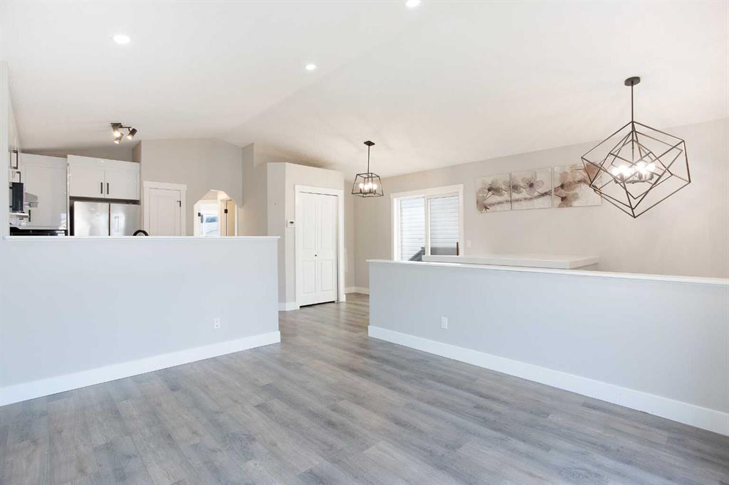 This property has been extensively renovated with a fresh, modern design and quality finishes that make it stand out. The curb appeal is immediate, with a classic exterior presence that blends seamlessly with its surroundings. Inside, the impressive vaulted ceilings and open layout create a bright and inviting atmosphere. A custom vinyl staircase greets you at the entry, leading up to the main living space where the newer vinyl flooring and a sleek electric fireplace set the tone for comfort and style.