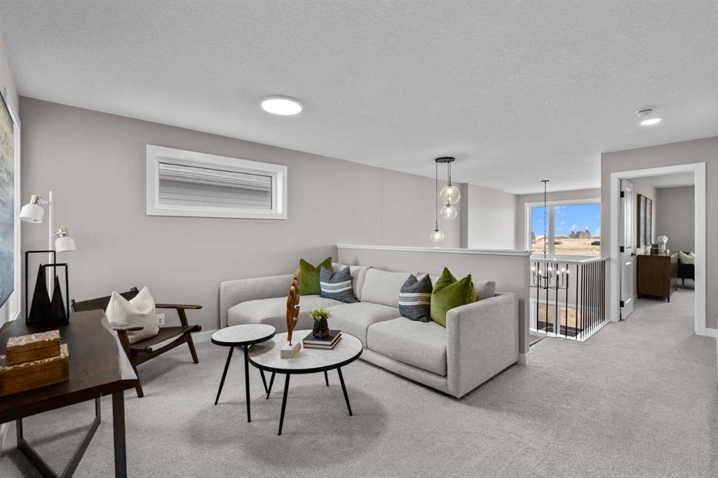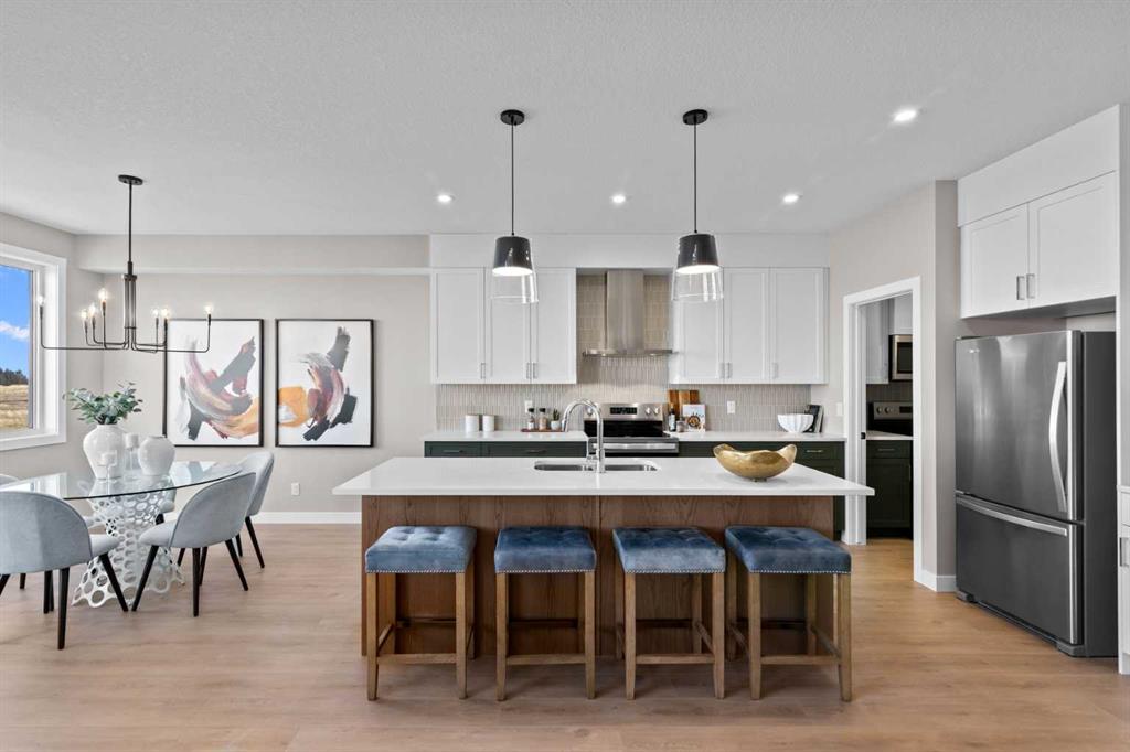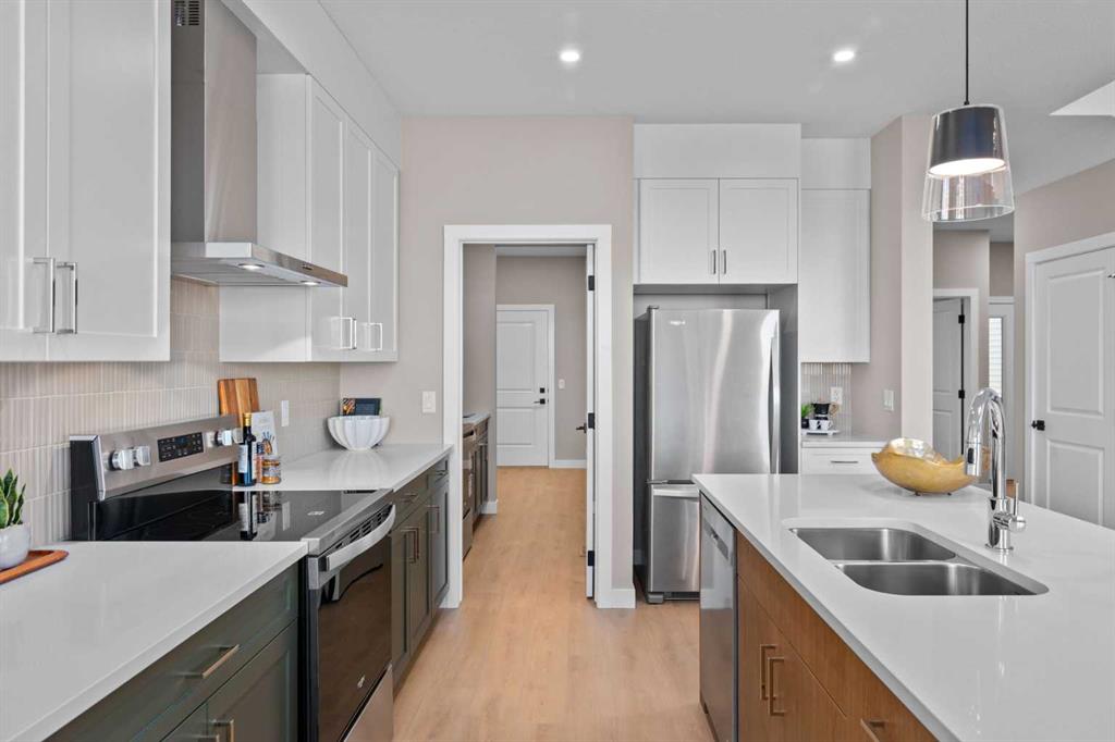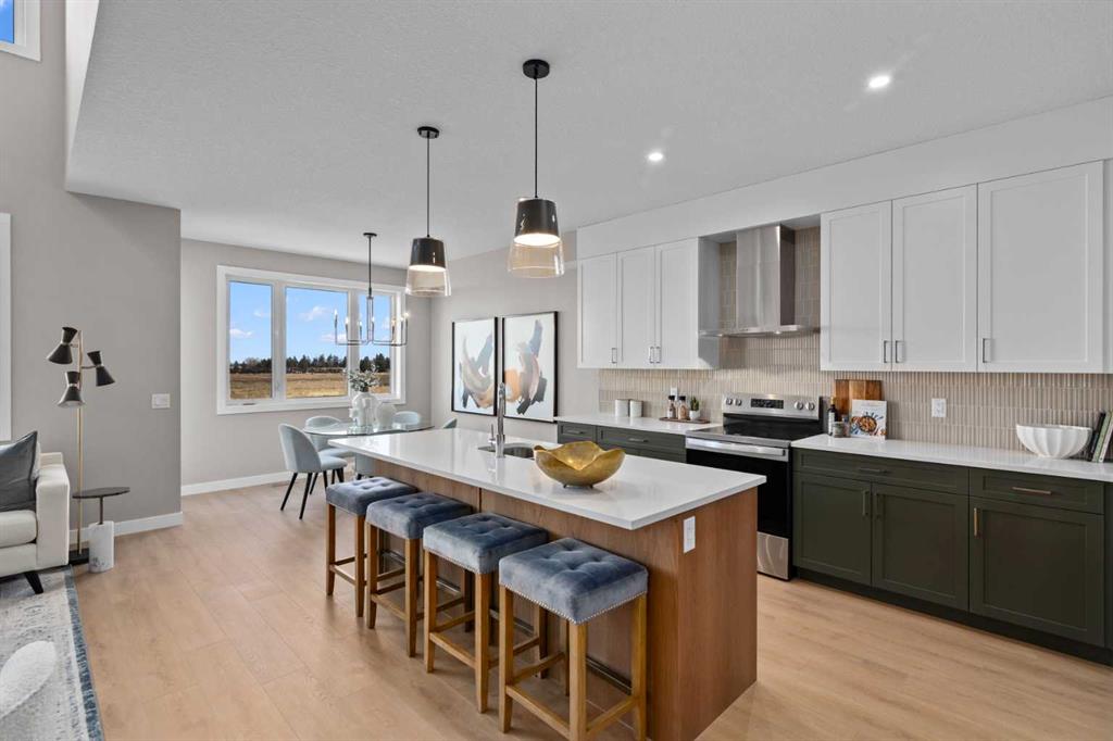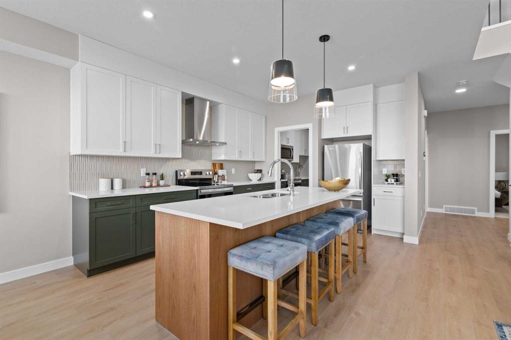 IMMEDIATE POSSESSION | 2,277 SQ.FT. | 5-BED | 3-BATH | MAIN FLOOR BED + BATH | OPEN TO ABOVE | SPICE KITCHEN | SEPARATE SIDE ENTRANCE | DECK | FRONT LANDSCAPING | HARDIE BOARD SIDING | This stunning home by Crystal Creek Homes BACKS ONTO GREENSPACE and is designed for everyday family life. The MAIN FLOOR has a BEDROOM and FULL BATH, perfect for grandparents or anyone who prefers to avoid stairs. Or use it as a home office. The standout kitchen features full-height cabinetry, quartz counters, and a SPICE KITCHEN to keep fragrant cooking contained. An open-to-above great room with large windows fills the space with light, and the dining area opens onto a rear deck that’s perfect for summer barbecues and morning coffee. Upstairs there are four bedrooms, including a spacious primary suite, a bonus room, a 5-piece bathroom, and convenient laundry. The 9' BASEMENT and separate SIDE ENTRANCE provides future suite potential (subject to approval and permitting by the City). Hardie board siding adds durability, and a full builder warranty is included for peace of mind. Belvedere offers quick access to Stoney Trail, East Hills shopping, and future parks and schools. Book your showing today!