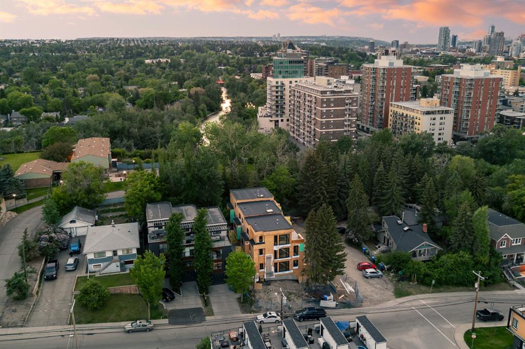 This three storey townhome incorporates modern-traditional interior design elements for a sophisticated and timeless aesthetic. Perched upon a hill in one of Calgary's most iconic river communities overlooking the picturesque skyline, this brand new unit is a culmination of high quality materials, thoughtful finishing selections, and grand inclusions. The attached triple car garage and private elevator are characteristic of the many luxurious additions strategically embedded within this home. The main floor layout includes a chef's kitchen with premium panel-ready appliances, dining room, living area with gas fireplace, powder room, wet bar, built-in desk area, main floor balcony with sweeping city views, and an outdoor BBQ deck at the rear. On the second level there are two bedrooms, each with walk-in closets and 4 piece ensuites, along with laundry and a den. The entire third floor is occupied almost entirely by a spacious primary retreat with another gas fireplace, a walk-in-closet, an attached 6 piece ensuite including a steam shower, bidet and in-floor heating, an additional wet bar, and a third level balcony (designed and loaded for a hot-tub) overlooking the city. This intentional floorplan prioritizes comfort and convenience while maximizing utilization of space. Intricate millwork, ornate wall and ceiling mouldings, curved kitchen island, brush gold accents, 9 foot ceilings, and herringbone hardwood all work together seamlessly to emulate carefully curated beauty. With unrivalled cityscape views, this home is a testament to deluxe inner city living. Notable specifications include: quartz countertops, Spanish porcelain tile, engineered European Oak hardwood, custom designed casing & mouldings, designer light fixtures, LED backlit staircase railings, millwork built-ins, satin brass and matte black hardware, along with rough-ins for speakers, a security system and power blinds.. Situated amongst the natural landscape of the river pathways and surrounded by some of the city's most notable landmarks in the peaceful community of Erlton. Quickly access the shopping and dining opportunities along 4th street, the brand new Convention Centre, Calgary Stampede Grounds, and get to the downtown core in minutes. Expected Completion September 2025. Renderings are for artistic purposes only and to give a sense of space. Actual specifications of completed product may differ. Inquire for a list of customizable and/or upgradable features.