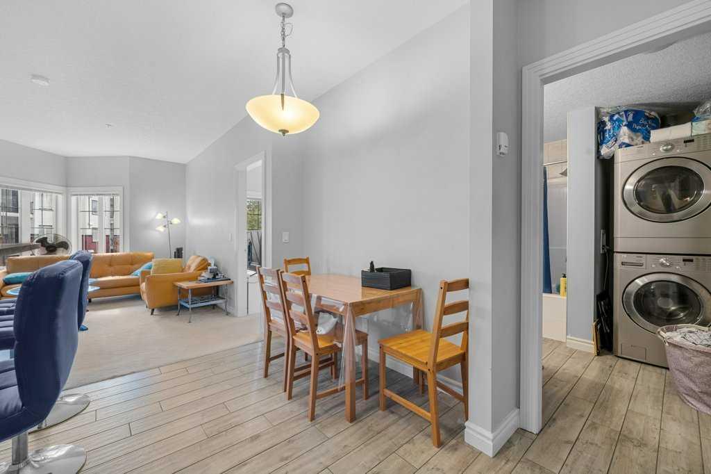The open-concept living space is filled with natural light from large windows and features a cozy breakfast nook and a modern kitchen with maple cabinetry, stainless steel built-in appliances, and an eating bar—perfect for casual dining or entertaining. Convenient in-suite laundry adds to the ease of living.