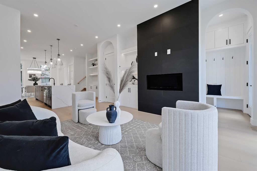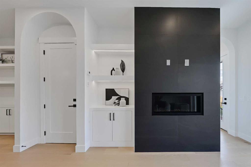 The main floor welcomes you with soaring 10’ ceilings, engineered hardwood floors, and custom millwork throughout. The open-concept living and dining area is anchored by a sleek gas fireplace with built-in shelving and large sliding glass doors that open to a bright facing backyard, perfect for indoor-outdoor living.