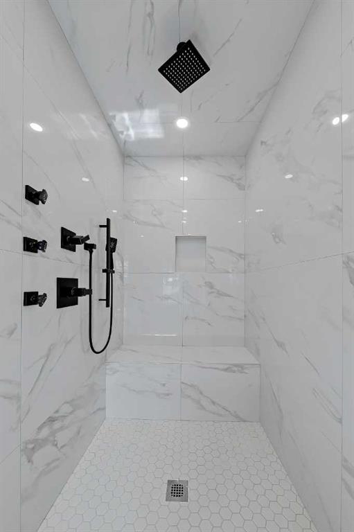 The chef’s kitchen is a showstopper, complete with premium stainless steel appliances, a custom range hood, quartz countertops, a central island with seating, and full-height cabinetry.