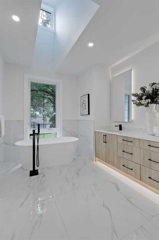 Upstairs, the primary retreat impresses with vaulted ceilings, a large walk-in closet, and a spa-like ensuite with heated tile floors, dual vanities, a glass shower, freestanding soaker tub, and private water closet. Two additional bedrooms with custom closets, a laundry room with sink and cabinetry complete the second floor.