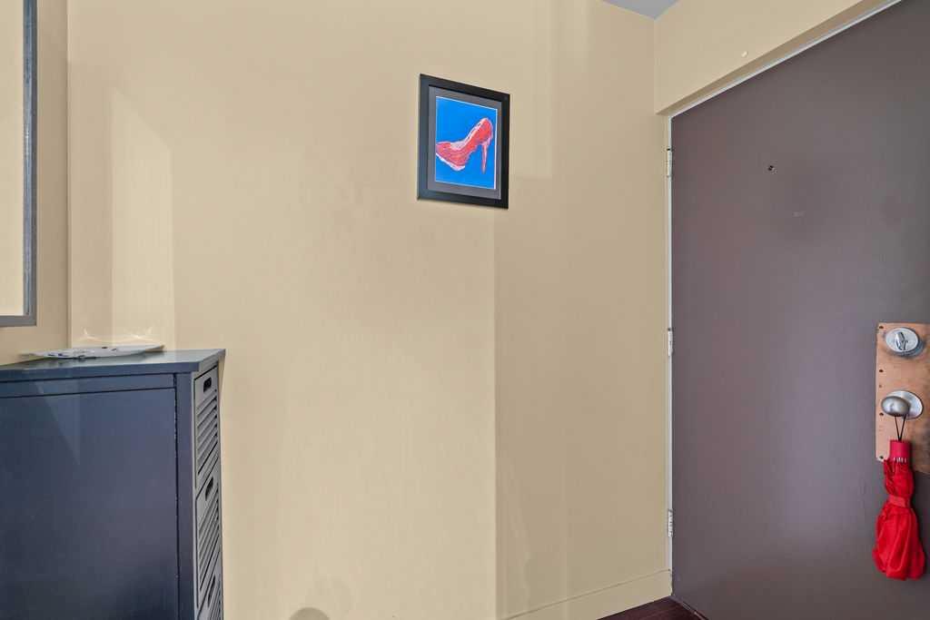 Step inside to discover gleaming hardwood floors that flow throughout the open-concept living space, filling the home with warmth and character. The spacious living area is bathed in natural light and opens onto a large covered balcony—perfect for morning coffee or evening drinks with stunning views of downtown and the north skyline.