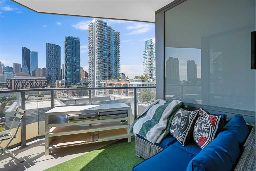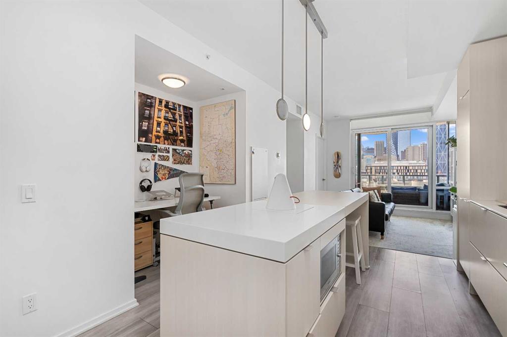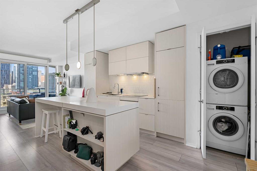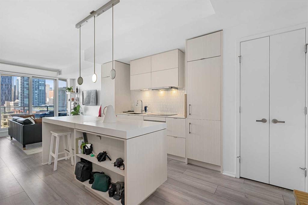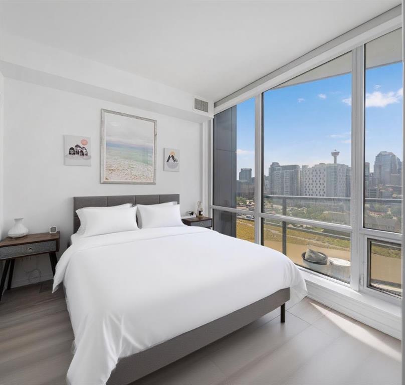 Attention Savvy Investors and Professionals! Look no further! Experience the Most Affordable LUXURY living condo in vibrant Downtown Calgary. Sunny WEST Facing unit with big balcony and fantastic VIEW! Modern kitchen with beautiful quartz countertops, built-in high-end appliances, and a big island. , Stylish tile backsplash, and ample cabinetry. In-suite laundry. Titled underground secured parking and a large storage locker on P2 level are included. The renowned sought-after building Verve features: Convenient full concierge service. Ample visitor parking and bike storage. Convenient Guest Suites provide accommodations for your visitors. Rooftop 25th floor observation/viewing deck and indoor gathering/meeting spaces. Sixth floor Spacious and luxury lounge/party room and outdoor hot tub, BBQ, gas fire pit, table tennis tables and outdoor furniture. Fitness Center is also on this floor. 24-Hour security. Pet-Friendly with board approval. WALKING distance to Bow River pathway, parks, island, LRT station, superstore, city hall, central library, community garden, restaurants, national music center, stampede park, casino, Chinatown and downtown core office buildings. One of the Best school systems includes Western Canada High School etc. ACT NOW before it’s gone again!