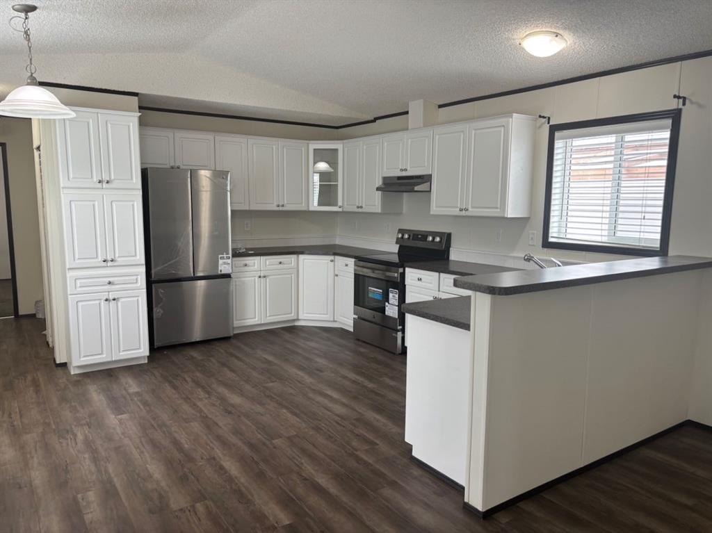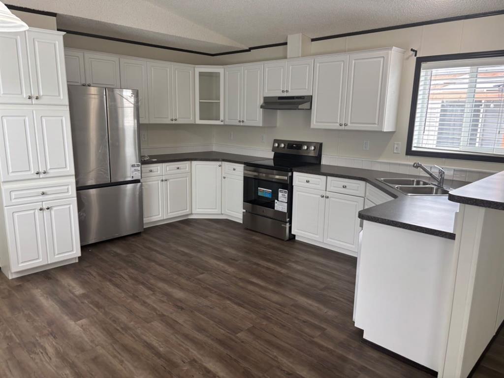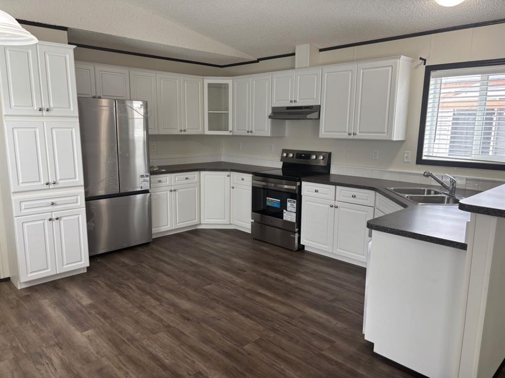 The kitchen is a chef's delight, featuring brand new stainless steel appliances that combine style and functionality. Ample cabinetry provides plenty of storage, making meal preparation a breeze. Natural light flows through the home, enhancing the inviting atmosphere. Retreat to the generously-sized primary bedroom, complete with a spacious walk-in closet and a luxurious 4-piece ensuite, creating your own personal oasis. Two additional well-appointed bedrooms provide versatility, ideal for guests, children, or even a home office. An additional 4-piece bathroom serves these bedrooms, ensuring comfort for everyone. This home has been thoughtfully designed for efficiency and comfort, featuring insulated skirting, air conditioning, and new roof, which provide peace of mind and energy savings year-round. Step outside onto the deck, perfect for enjoying the fresh air, hosting barbecues, or simply relaxing with a book. With new services and a layout that maximizes space and functionality, this mobile home is ready to welcome you into its embrace. Don’t miss your chance to own this fantastic home in Chateau Estates.