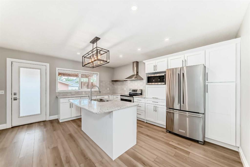 On the main level, step into the bright and spacious living room, where a large west-facing window fills the space with natural light, and a tray ceiling with soft back-lighting adds a touch of sophistication The fully renovated kitchen features pristine white cabinetry, granite countertops, stainless steel appliances, and stylish lighting along with a dining area—perfect for everyday family meals or entertaining guests. An updated 2-piece bath with convenient main-floor laundry completes the main level.
