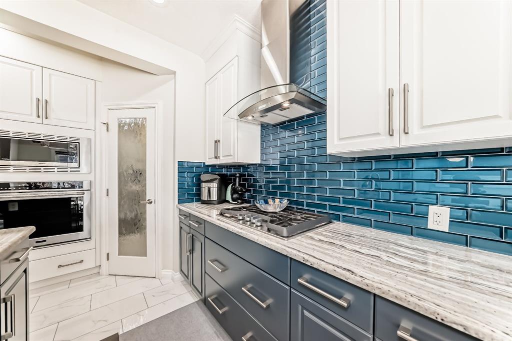 Modern kitchen featuring quartz countertops, chimney hood fan, SPICE KITCHEN, custom backsplash, gas stove, built-in oven & microwave, plus a massive central island