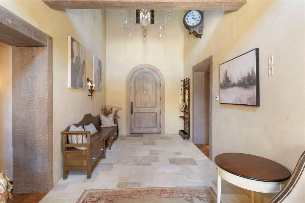 The exterior showcases stonework, hand sawn timber beams, industrial steel brackets, and an oversized custom entry door. Inside, arched doorways, barrel vaulted ceilings, and perfectly aligned sightlines frame picturesque views throughout.