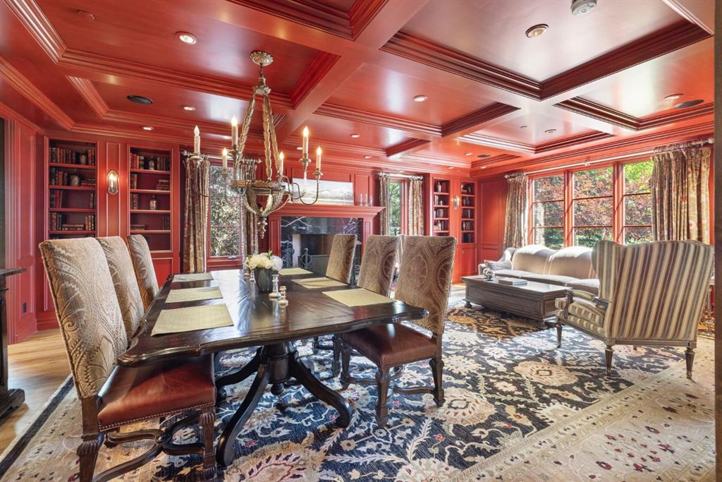 The grand foyer with its soaring ceiling and bridge walkway leads to a formal lounge with paneled walls, coffered ceilings, and a wood burning fireplace. At the heart of the home, a gourmet kitchen with slab marble islands and a full suite of commercial grade appliances opens to the central courtyard, a private gathering space with built in BBQ, wall fountain, and pergola topped brick patio. Just beyond, the family room features a travertine mantled fireplace and French doors to the west lawn.