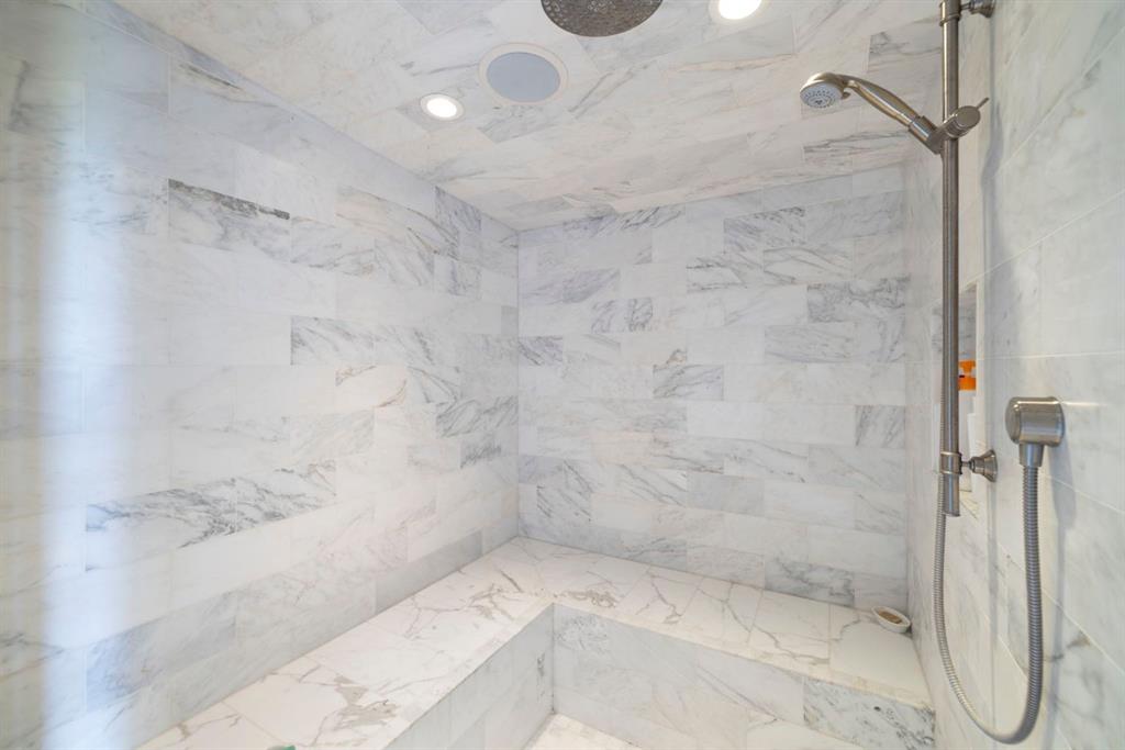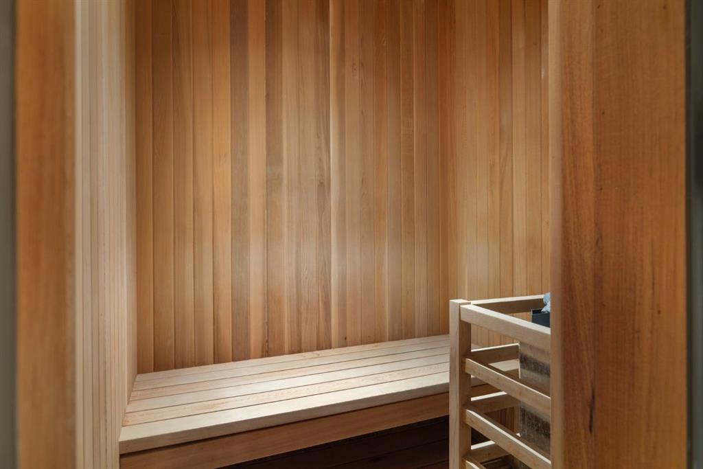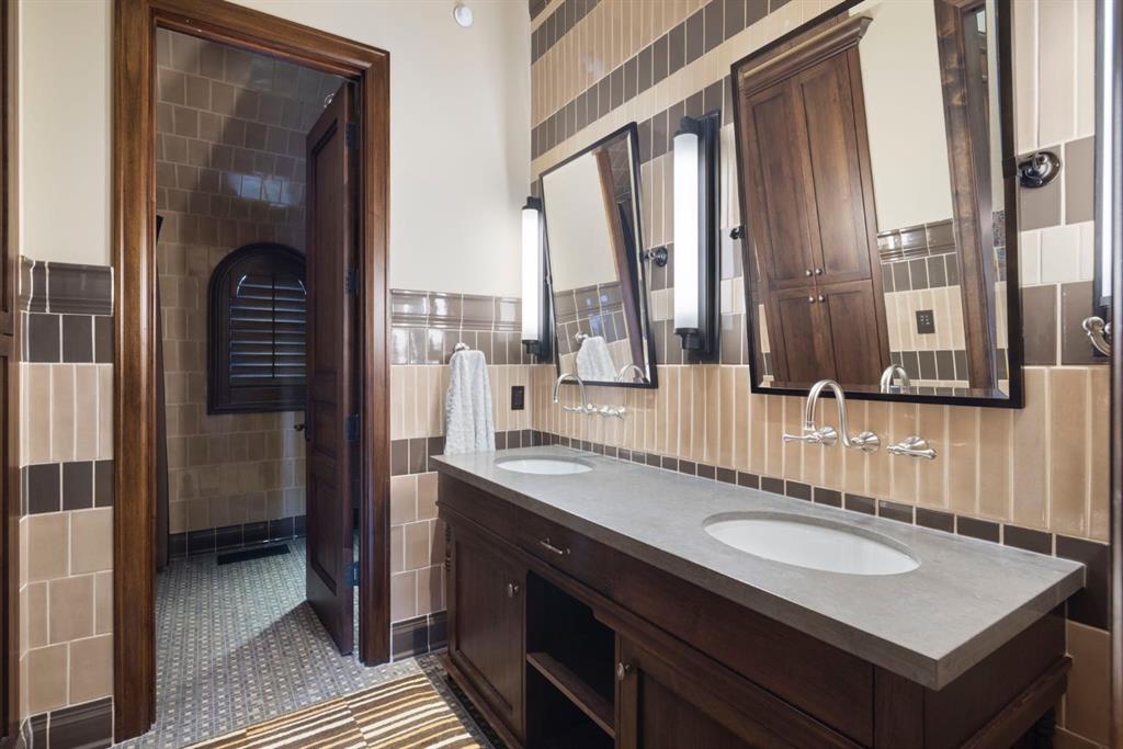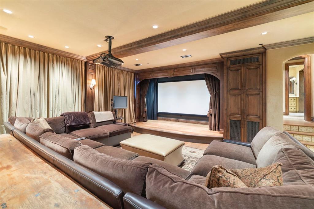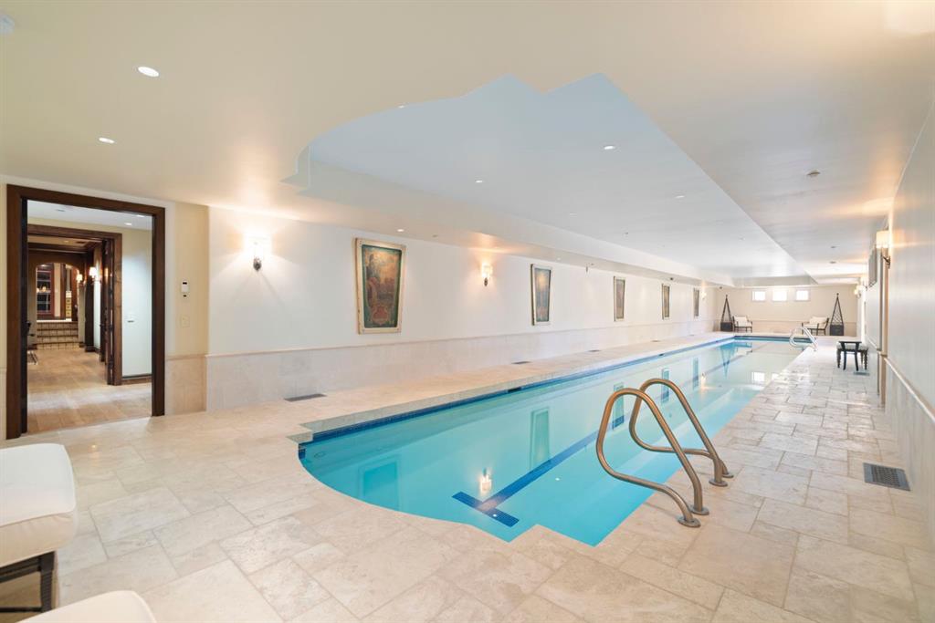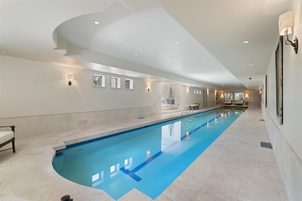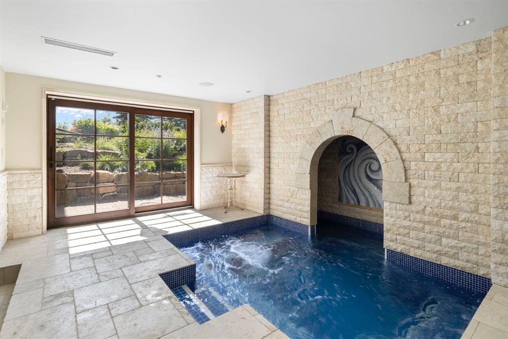 The lower level is designed for both leisure and entertainment, offering a 25-meter lap pool, spa inspired hot tub alcove, walkout patio framed by sandstone boulders, a private theatre with professional grade audio visual, a games room with fabric lined walls, and a brick barrel vaulted wine cellar.
