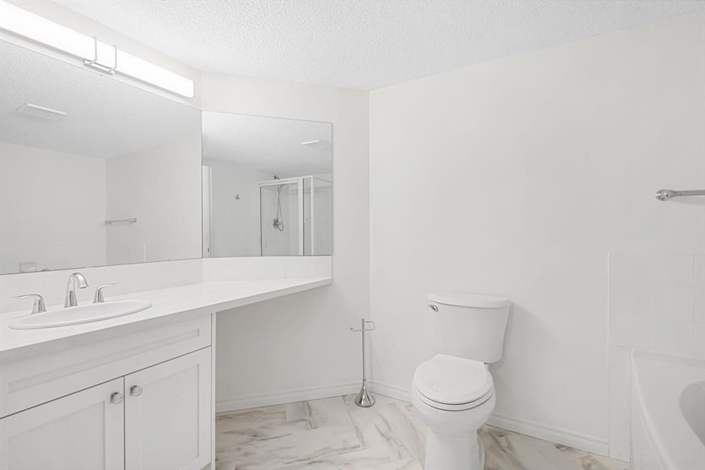 Recent renovations include brand-new appliances, new flooring throughout, updated countertops, cabinets, lighting, and a new washer and dryer. The spacious primary suite features a walk-in closet and a 4-piece ensuite, while the second bedroom is generously sized and conveniently located near the additional 4-piece bath.