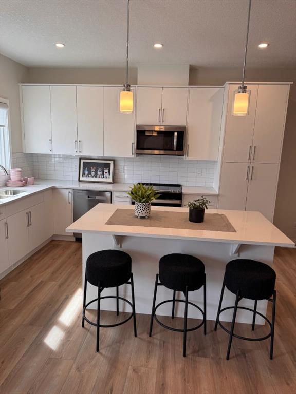 Welcome to this beautiful former West Creek show home in the heart of Wolf Willow. This gorgeous 2 storey duplex has almost 2500 square feet of developed space (developed basement) and comes with 4 bedrooms and 4 bathrooms. This show home comes with many extras including upgraded stainless steel kitchen appliances, washer/dryer, wood deck, modern wall art, kitchen tile backsplash and much much more. The kitchen is large with a very spacious island for preparing and enjoying meals. Bordering the kitchen is a very warm dining area and living room which is perfect for entertaining family and guests. The mudroom leads to the single car, oversized garage. Upstairs there are 3 bedrooms, two bathrooms and a very large and convenient laundry room. The finished basement offers an additional bedroom, 4 pc bathroom and a nice sized family room. Wolf Willow is a very modern and new community in the heart of South Calgary. It is close to schools, shopping, golf and minutes from the South LRT Station. This community is also amazing for active families with endless amounts of trails next to the Bow River. This home comes with access to a private fire pit, gardens for growing vegetables and a lovely picnic area. Come book your showing today and see what South Calgary living is all about.
