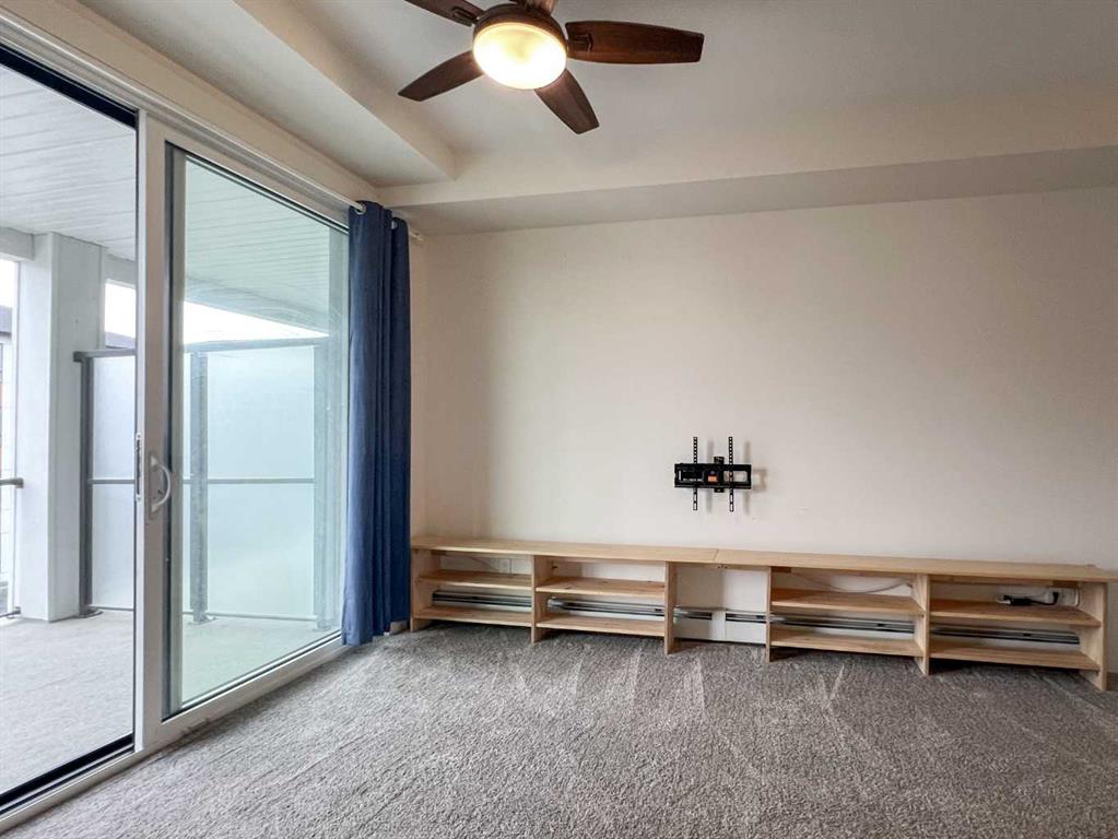 The open-concept layout features a contemporary kitchen with quartz countertops, soft-close cabinetry, pantry, and a full stainless-steel appliance package. The spacious living and dining area extends to a private balcony with glass railing—ideal for morning coffee or evening relaxation. The primary suite includes a walk-through closet and private ensuite, while the second bedroom and full bath offer great flexibility for guests, family, or a home office.