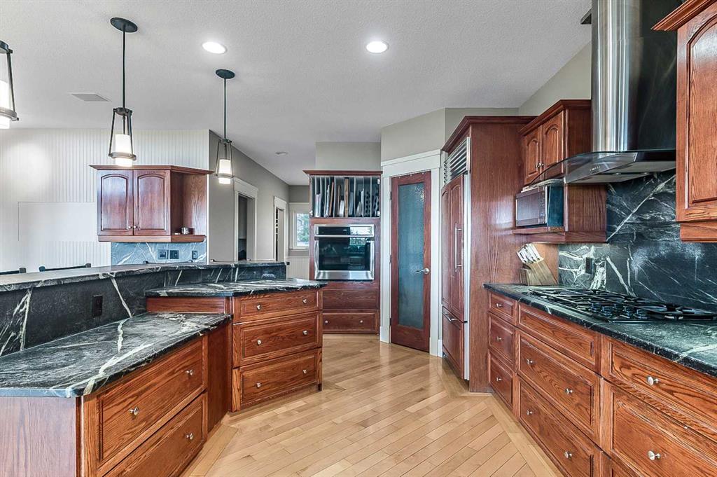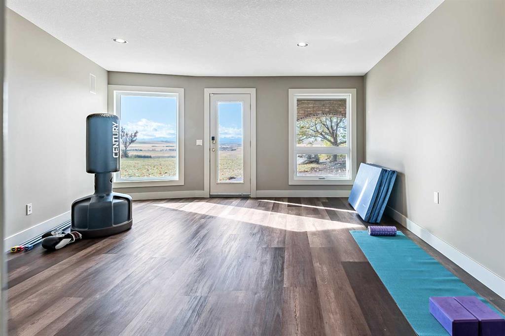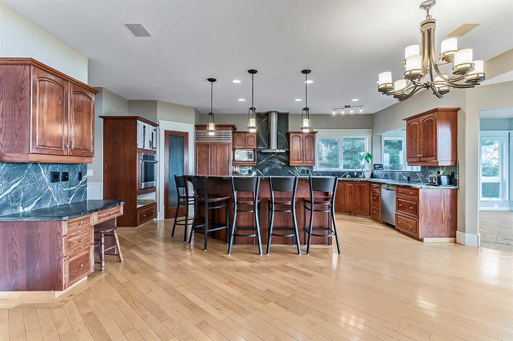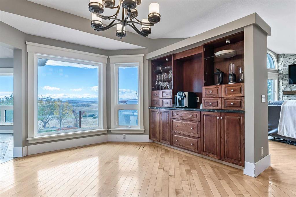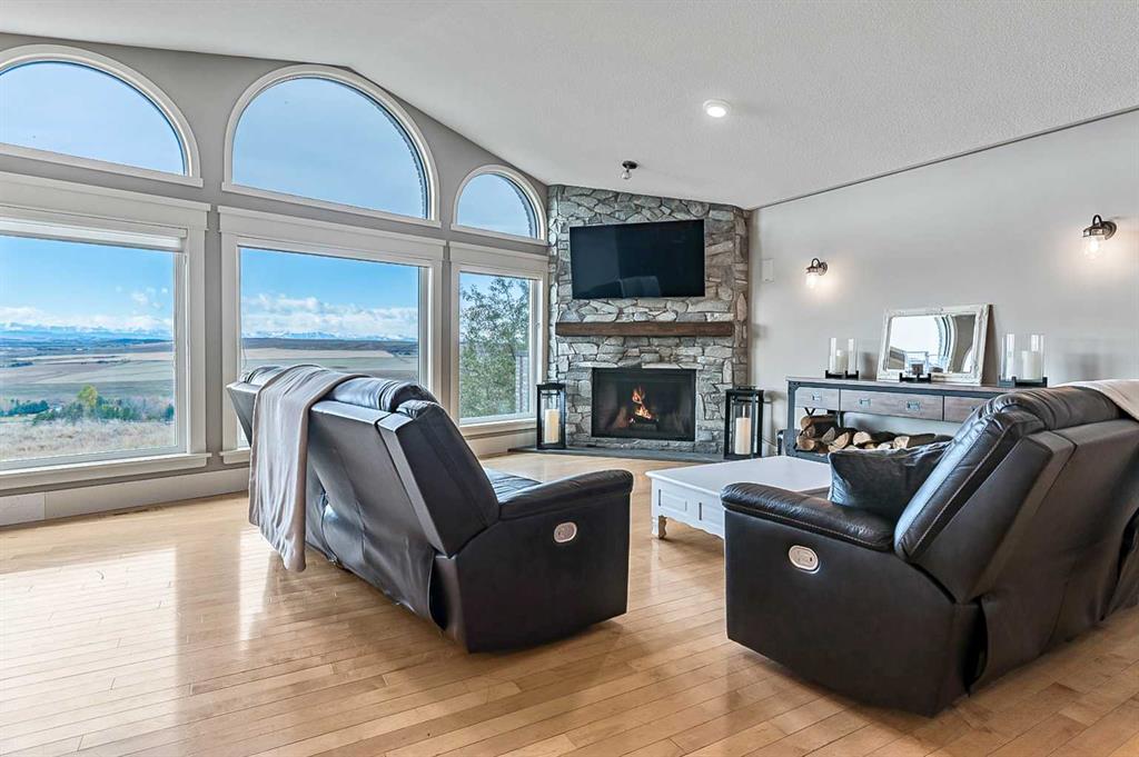 Imagine waking up to breathtaking panoramic views of the Rocky Mountains and rolling valleys, where the sun dips dramatically behind snow-capped peaks each evening—right from your west-facing windows. Nestled on over 55 acres of prime agricultural land in Rural Foothills County, this exceptional walk-out bungalow delivers 2,450 sq. ft. on the main level plus a fully developed basement, totaling 4,700 sq. ft. of luxurious living space. With 4 bedrooms, 4 bathrooms, office air conditioning, and thoughtful features like a large open kitchen, all-season sunroom/dining room flowing to expansive decks, vaulted living room with a stunning newer stone wood-burning fireplace, and premium hardwood, slate, and cork flooring throughout. The lower level boasts a family room with wet bar and wine cellar, dedicated media room, gym, abundant storage, and cozy lower deck access. Plus, an oversized attached double garage for all your needs.