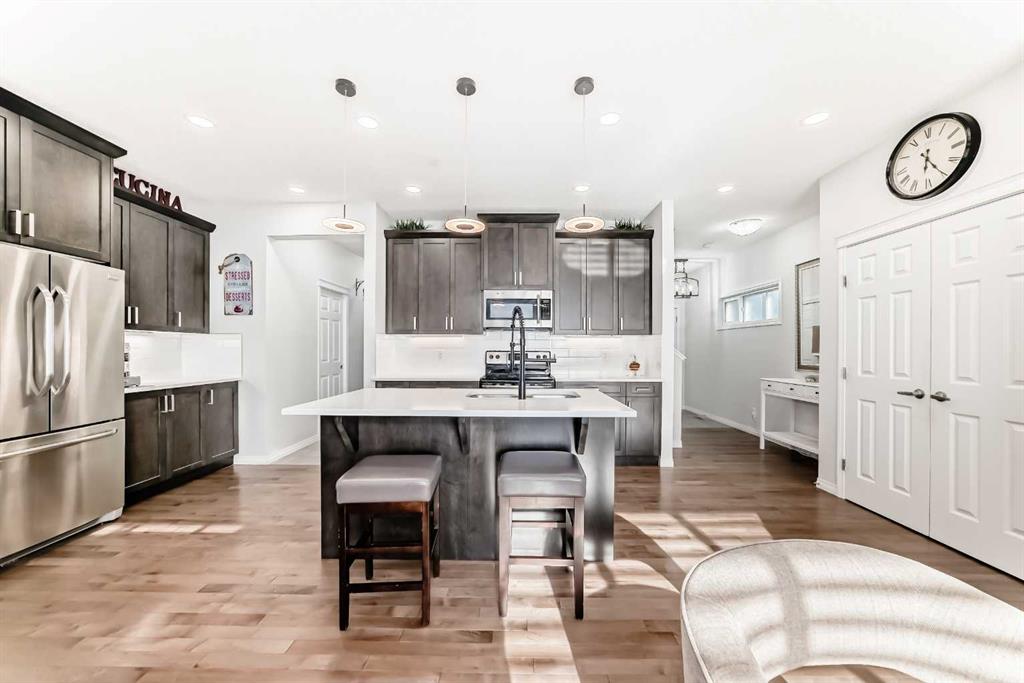 Excellent opportunity to own this beautiful home in the desirable community of Walden. Located on a quiet street and close to green spaces and all amenities. The welcoming, spacious foyer effortlessly introduces you to the well-designed open floor plan with beautiful hardwood floor and 9ft. ceiling. The stunning kitchen features a huge island, quartz countertops, stainless steel appliances, rich espresso cabinetry, subway tile backsplash, along with generous counter and storage space.The Living room has large windows allowing the natural light to fill your home. Cozy up next to the gas fireplace with a tile surround and a wooden mantel. The spacious Dining Room opens onto a large deck with a pergola, perfect for barbecues and family gatherings. A 2pc. bathroom, corner pantry and a spacious mudroom with access to the Double Attached garage complete the main level. As you move up to the upper level, you'll find a office nook and spacious Bonus Room with beautiful accent wall. The Laundry Room is conveniently located adjacent to the bonus room with great storage and front load washer dryer. Impressive large master bedroom is a true retreat featuring a large walk-in closet, 5 piece ensuite with large tub, separate shower and dual sinks. The TWO additional Bedrooms are generously sized with one boasting a walk-in closet as well. The basement is unfinished with good layout offering a huge potential for customization. Entire house and carpet were professionally cleaned and ready for you to move in! Don't miss out on this beautiful family home.