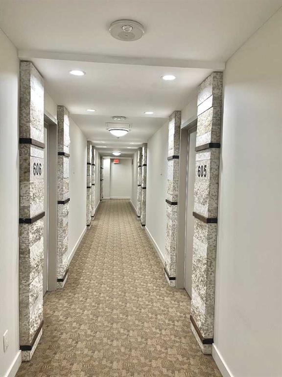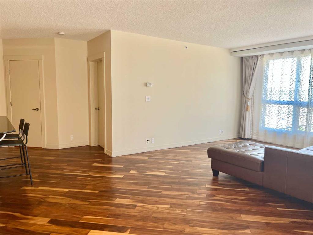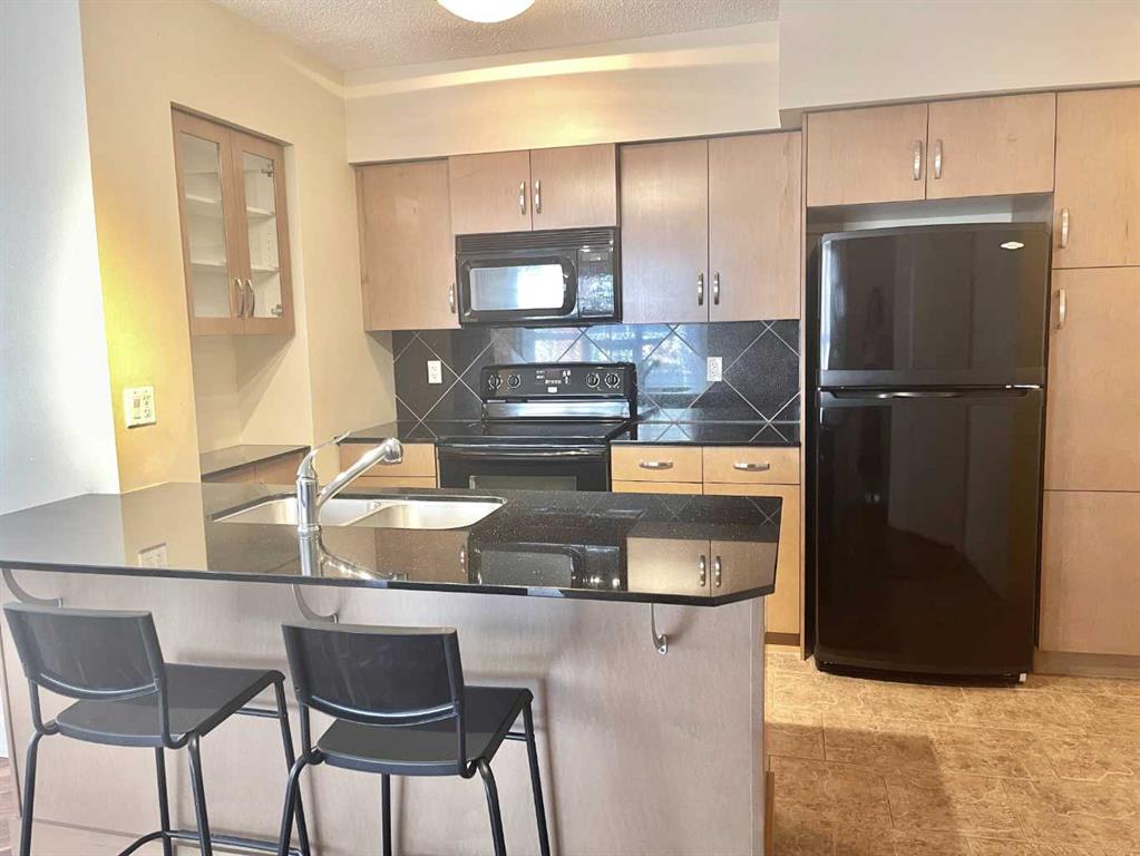 Presenting the largest corner unit in the building—an exceptional 2-bedroom, 2-bathroom residence offering 1,038 square feet of thoughtfully designed living space. This upgraded residence features stylish engineered hardwood flooring and an open concept floor plan. A spacious and welcoming foyer with a double closet sets a sophisticated tone upon entry. Expansive windows throughout the unit allow for an abundance of natural light, further enhanced by the addition of elegant, customized double-layer curtains that provide both privacy and light control. The modernized kitchen is outfitted with updated cabinetry and striking black granite countertops, complemented by a suite of matching black appliances. The generous living room offers ample space for comfortable seating arrangements, with an adjacent dining area that opens to a private balcony featuring pleasant views. The primary bedroom includes a well-appointed four-piece ensuite, adding to the home's overall functionality and comfort. Residents will appreciate the building’s direct access to essential amenities, including nearby grocery stores and restaurants, all reachable without the need for elevator use. A convenient door one level below provides quick, weather-free access to Save-On-Foods via the 4th-floor parkade. Additional features include on-site security, a dedicated concierge, and ample indoor and guest parking. Situated in a highly desirable location within walking distance of numerous services and conveniences, this professionally upgraded unit with a sought-after layout represents exceptional value in today’s market.