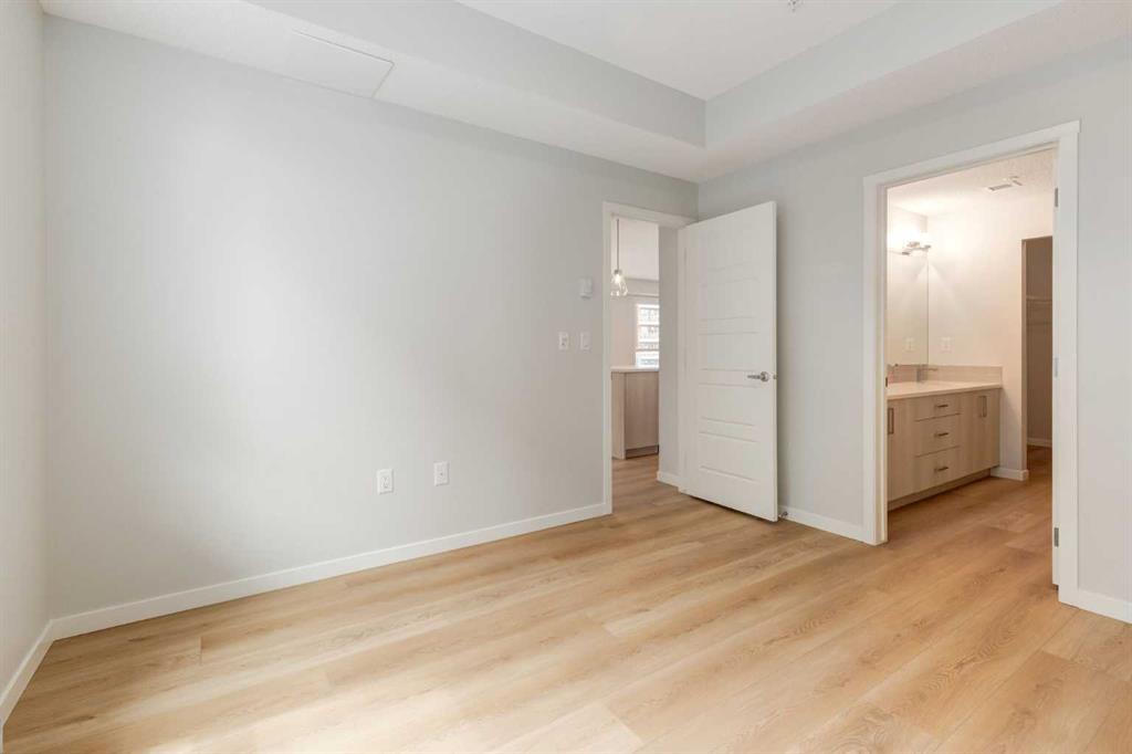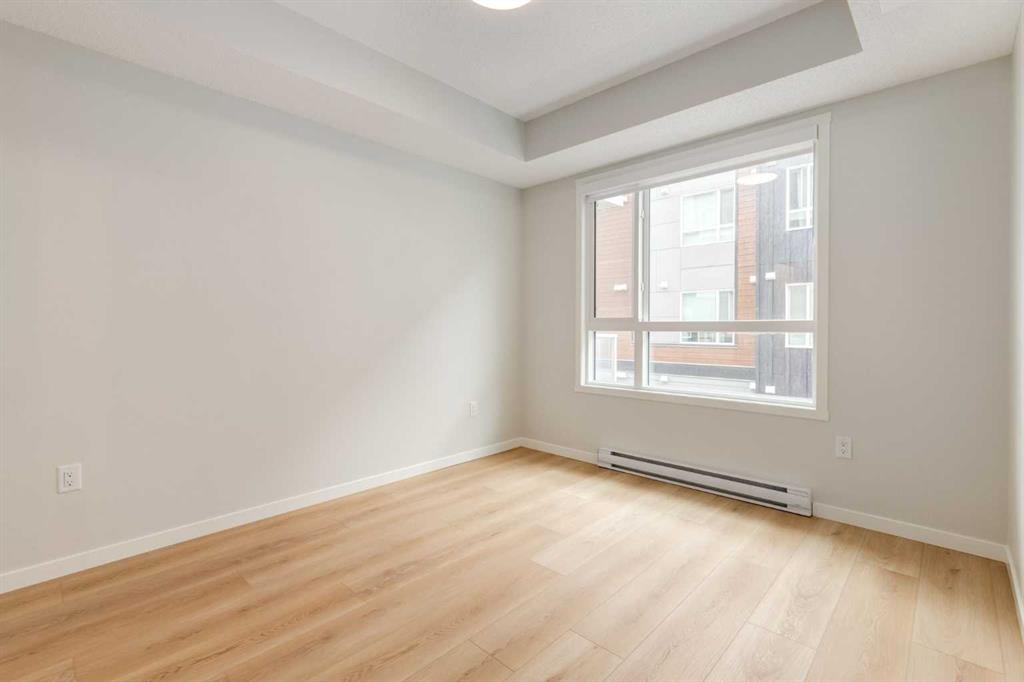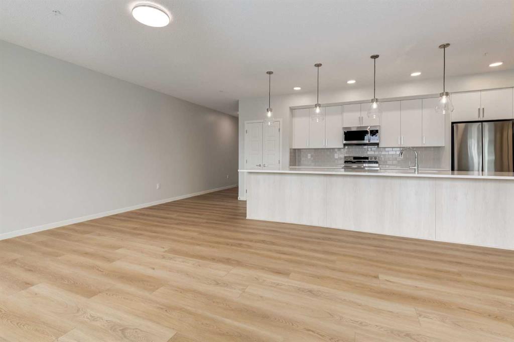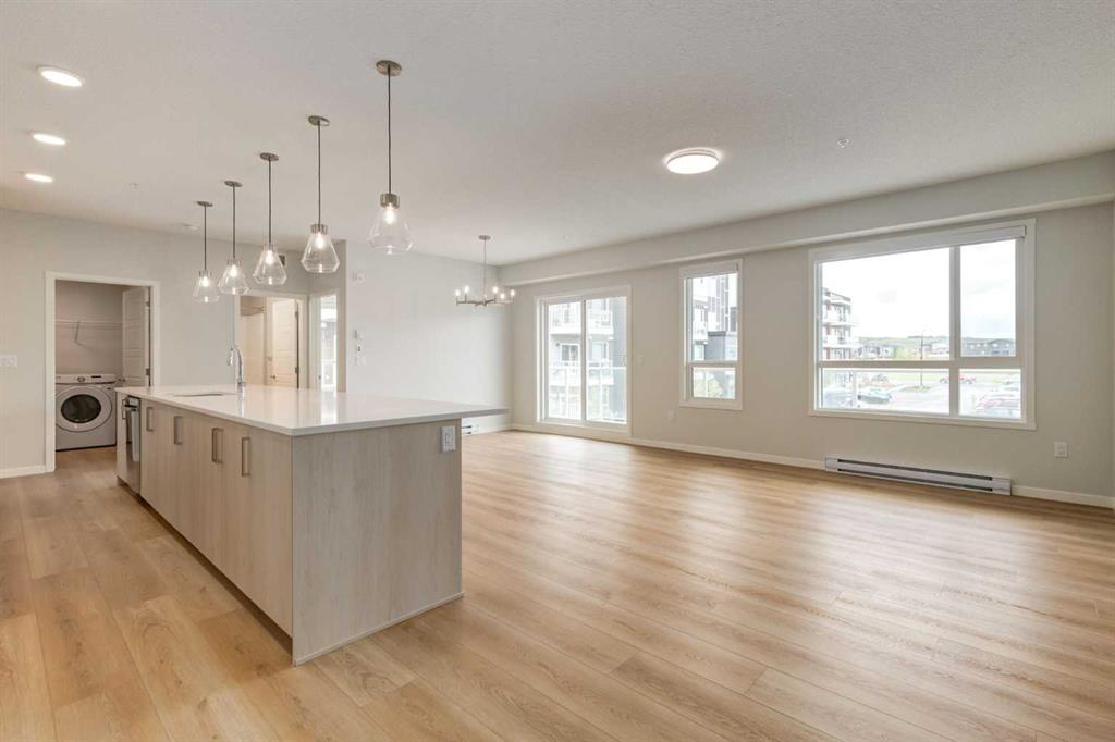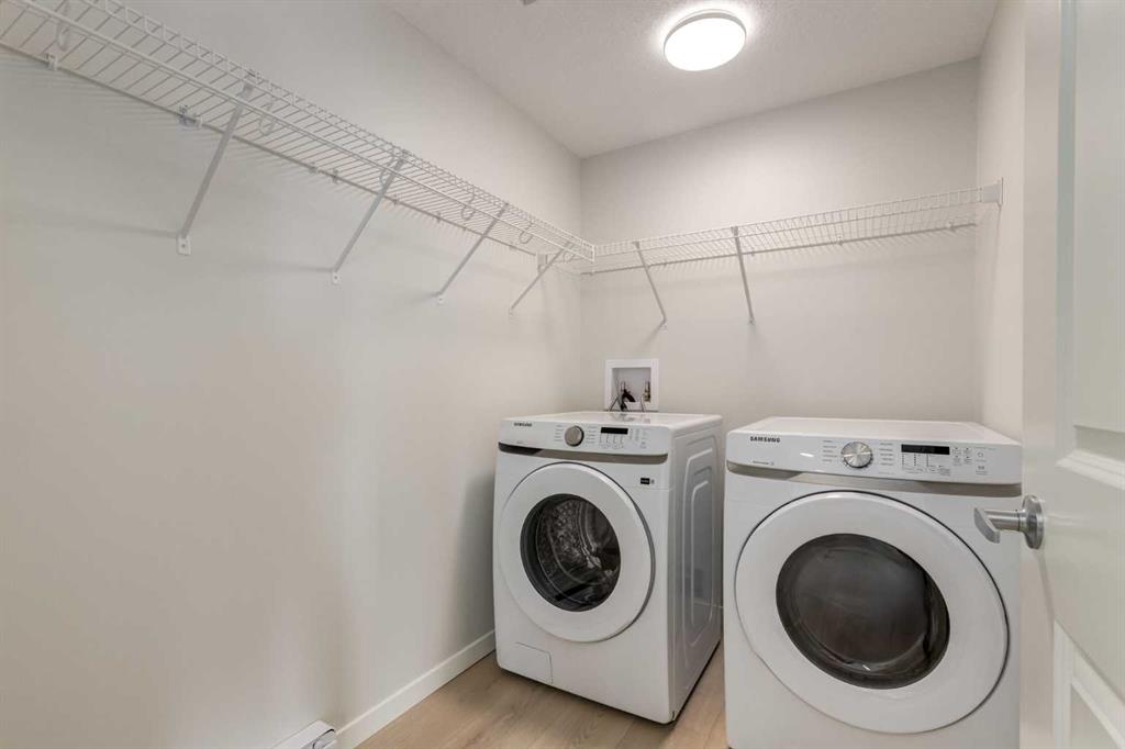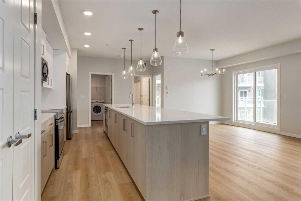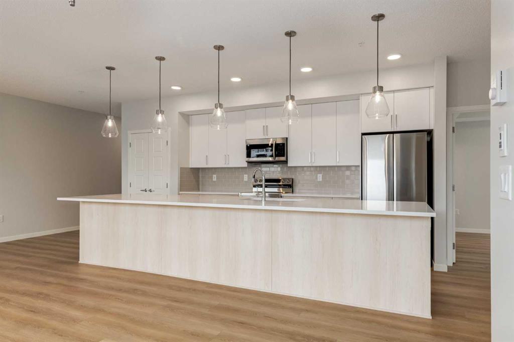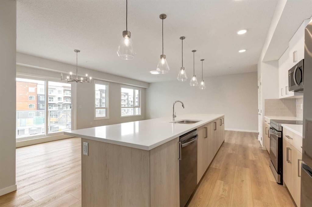 Introducing BELMONT PLAZA, a highly sought-after development in BELMONT, Calgary. BUILT BY CEDARGLEN LIVING, WINNER OF THE CustomerInsight BUILDER OF CHOICE AWARD, 5 YEARS RUNNING! BRAND NEW CORNER UNIT, "L4" floor plan with high-spec features. You will feel right at home in this well thought-out 1092.8 RMS sq.ft. (1165 sq.ft. builder size) 2 bed, 2 bath home with open plan, 9' ceilings, LVP flooring through-out (upgraded, no carpet), Low E triple glazed windows, electric baseboard heating, BBQ gas line on the patio, A/C Rough in, and Fresh Air System (ERV). The kitchen is spectacular with full height TWO TONE cabinets, extended island upgrade, quartz counters, undermount sink, S/S appliances and pantry. The extended island is stunning and transitions into the spacious living & dining area, perfect for entertaining. The spacious primary bedroom has a large bright window, sizeable walk-in closet and 4 pc ensuite with extra bank of drawers & full height tile upgrade. 1 additional bedroom located across the unit for noise reduction/privacy and 4pc bathroom (also with upgraded full height tile) located nearby. Laundry & storage closet is thoughtfully planned, definitely a must see (washer/dryer included). Highlights include: upgraded lighting package, sound reducing membrane to reduce sound transmission between floors, clear glass railing to balconies and 1 titled underground parking stall included. Steps away from shopping, restaurants and so much more. Belmont offers a vibrant neighbourhood that’s extremely well-connected through Calgary’s major arteries. Community living with inspired design. PET & RENTAL FRIENDLY COMPLEX.