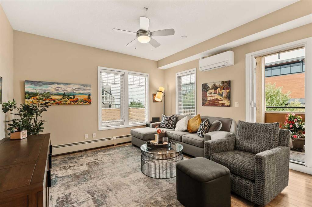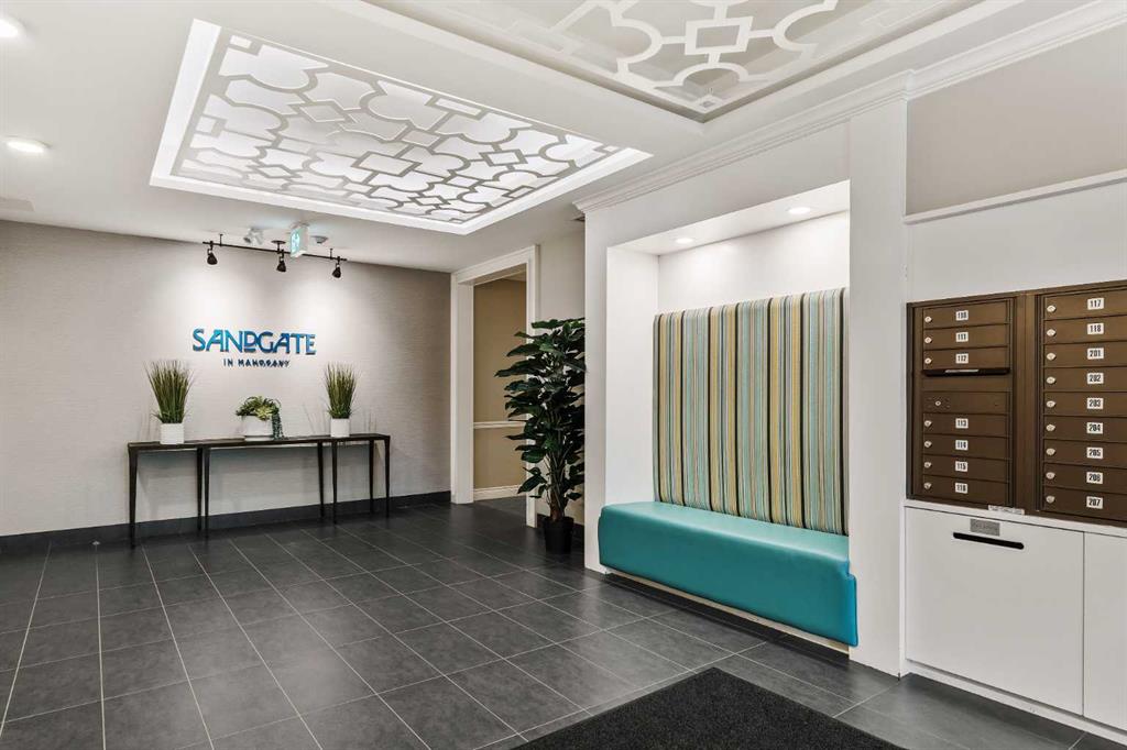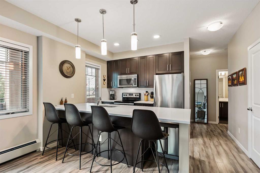 Welcome to Sandgate at Mahogany Lake. This custom built south east facing corner suite offers air conditioning and a private 36 by 6 foot deck that captures the sun throughout the day. The open concept layout features a bright living room with four large windows overlooking the courtyard and a stylish kitchen with quartz countertops, upgraded cabinets, a peninsula island, and premium stainless steel appliances. Two bedrooms and two full bathrooms are located on opposite sides of the living space for privacy, each with organized closet cabinetry. Residents enjoy exceptional amenities including a 1300 square foot fitness centre, a welcoming common area library, and two comfortable guest suites for visiting family and friends. Additional features include nine foot ceilings, luxury vinyl plank flooring, concrete construction, extra storage, and titled underground parking. All of this is set within award winning Mahogany, where you can enjoy year round recreation at Calgary’s largest lake along with walkable access to Mahogany Village Market with its shops, cafés, and restaurants including Sobeys, Tim Hortons, State and Main, and the renowned Chairman’s Steakhouse.