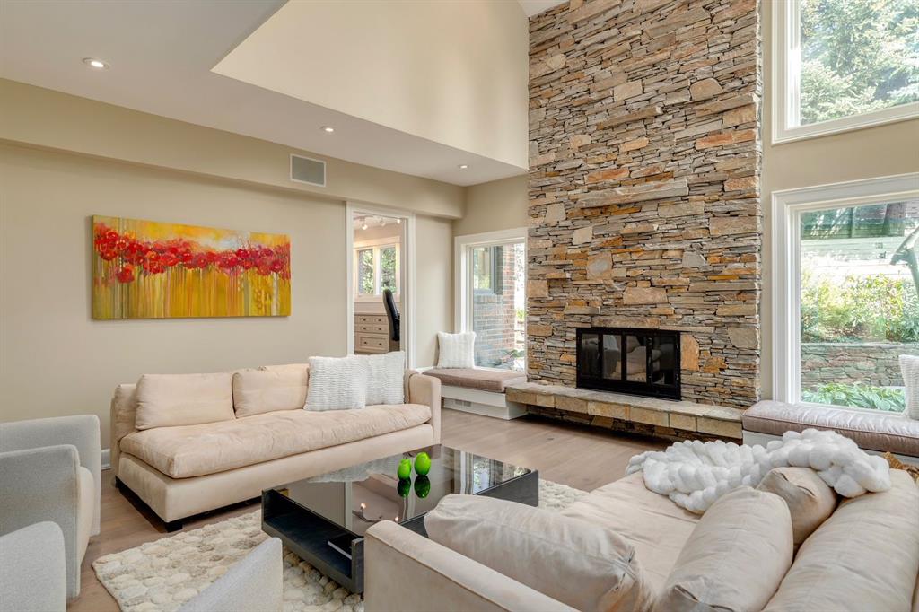 Step into a beautifully transformed post-modern home, originally built in 1983, where contemporary elegance meets timeless charm. This expansive residence boasts 6 bedrooms, a gym, a main floor office, 2 staircases, a formal dining room, 5 fireplaces, and a versatile basement bedroom with a 3-piece ensuite, perfect for family or guests.