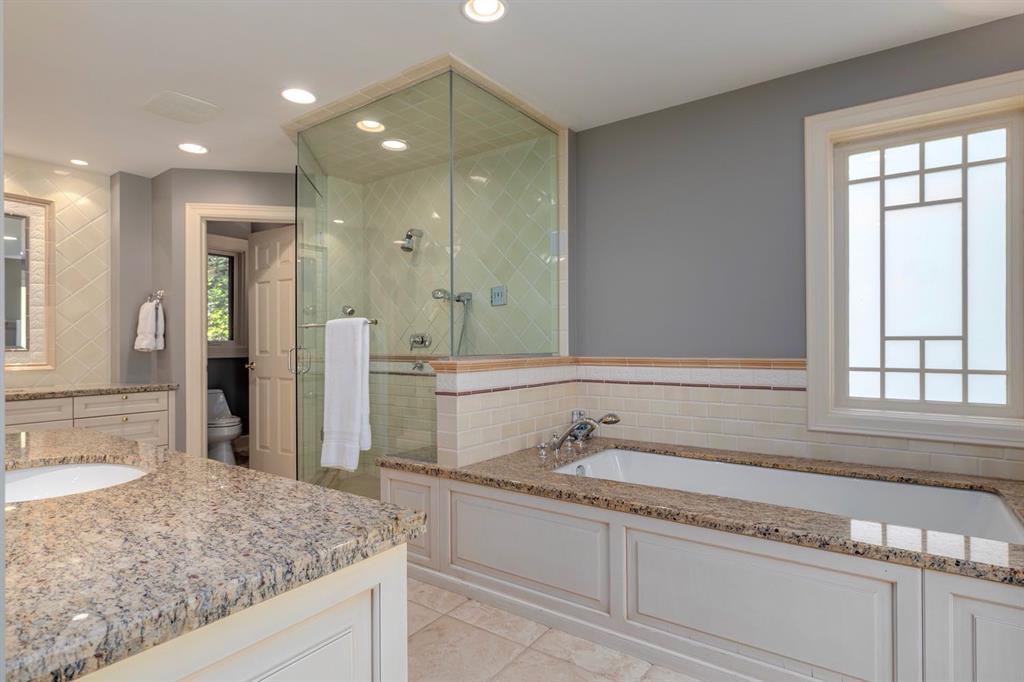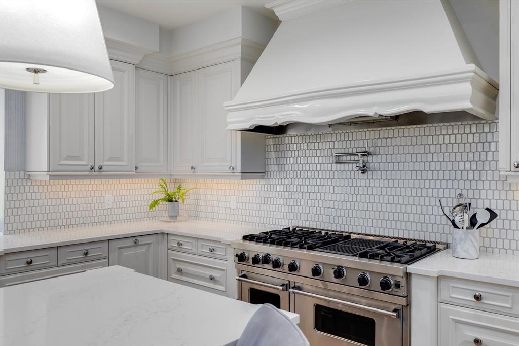 At the heart of the home, the newly renovated kitchen is a chef’s dream. Featuring a built-in Wolf gas range, pot-filling tap, filtered water tap, built-in refrigerator, expansive island with breakfast bar, and a wine refrigerator with two beverage drawers, this kitchen is both functional and stylish. Its open layout flows effortlessly into the dining and family room, where a floor-to-ceiling wood-burning fireplace sets the mood for cozy evenings.