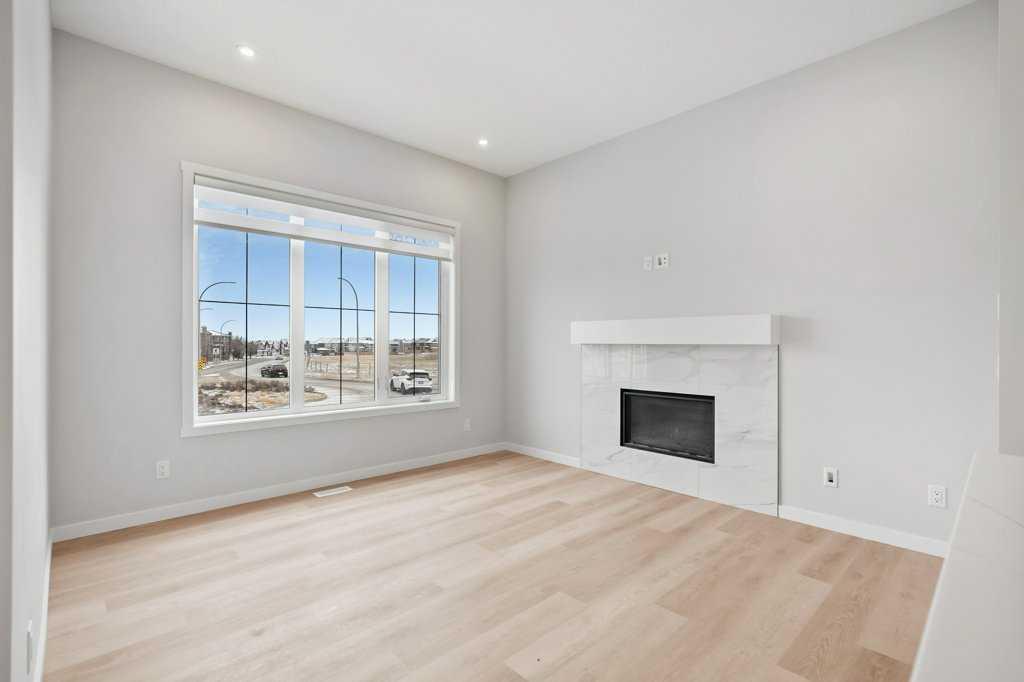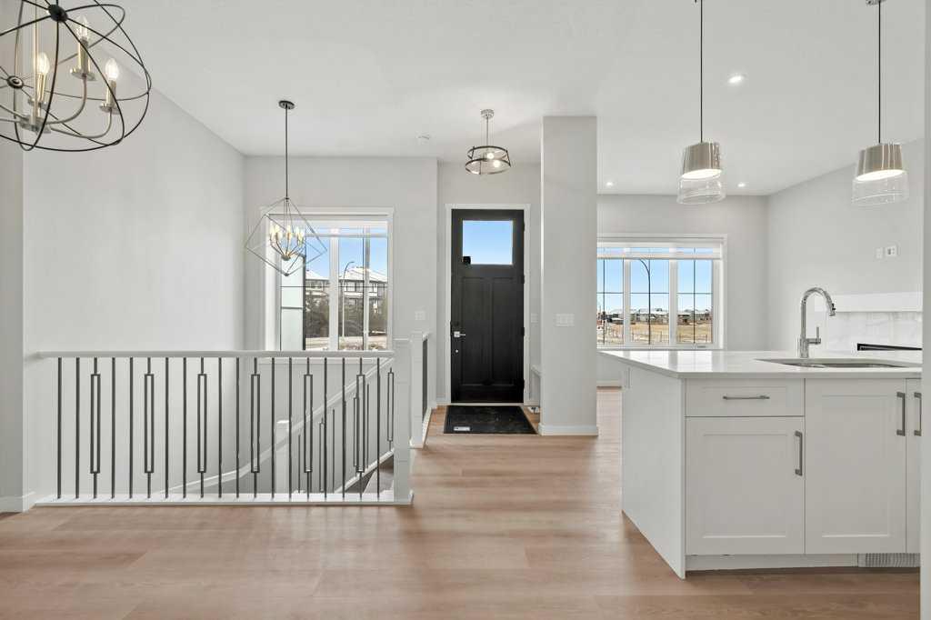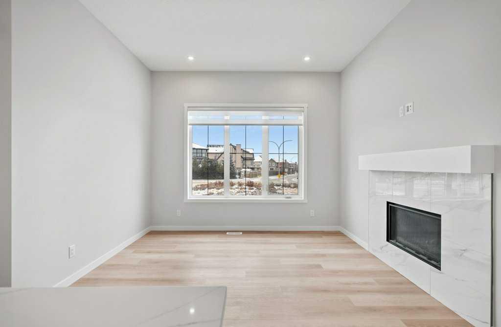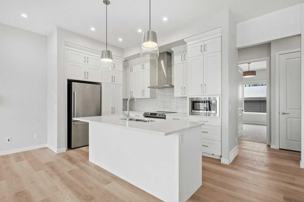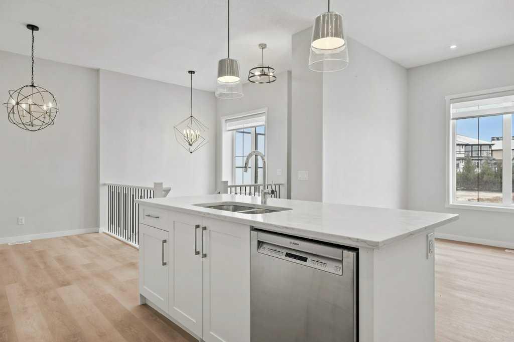 Lakeside living at its finest! Presenting a fully developed bungalow villa with over 1750 square feet of developed space, Gemstone lighting, NO CONDO FEES, located steps to Mahogany's main beach, central park and across from the future historic Ollerenshaw farm. Enter into 10' knock down ceilings, a front lifestyle room with focal gas fireplace, luxury vinyl plank and connects seamlessly to the entertainment size kitchen boasting a plethora of stacked classic white cabinets, quartz counters, built in microwave and soft close mechanics and full stainless steel appliance package Off the kitchen is the family size dining area and access to the fully developed lower level. Convenient main floor laundry with access to the side entry to the private yard and double detached garage. The primary bedroom is set to the back of the plan, quiet and a generous size for all types of furniture placement with your tiled 3 piece en-suite bath designed with storage, quartz counters, and a full size shower. Open rail guides you to the lower level beginning with a media room, 2 added bedrooms a 4 piece tiled bath as well as plenty of storage wrapped in sunshine windows, 9' ceilings and rough in Central air. Experience this awarded winning 4 season community featuring 2 beaches, splash park, tennis, basketball and pickle ball courts, an urban village, parks, playgrounds, 74 acre wetlands, schools, transit, 22km of walking paths, 63 acre lake and year-round activities, both indoors and out.