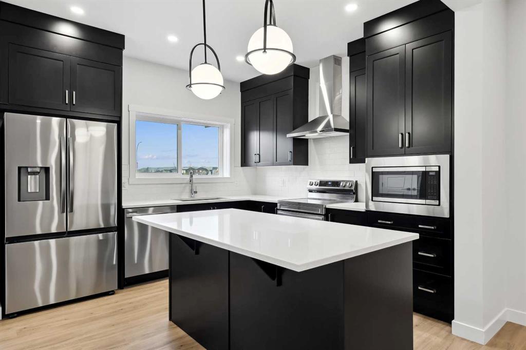 Welcome to the Luna model in Cochrane’s Fireside community, offering 1,528 sq. ft. with 3 bedrooms and 2.5 bathrooms. The main floor is designed with an open layout that connects the great room, dining area, and kitchen. In the kitchen you’ll find quartz countertops, Chantilly Lace shaker cabinetry, a Blanco Silgranit sink in Truffle, Boardwalk matte white backsplash, and a Mistral island that provides both workspace and seating.