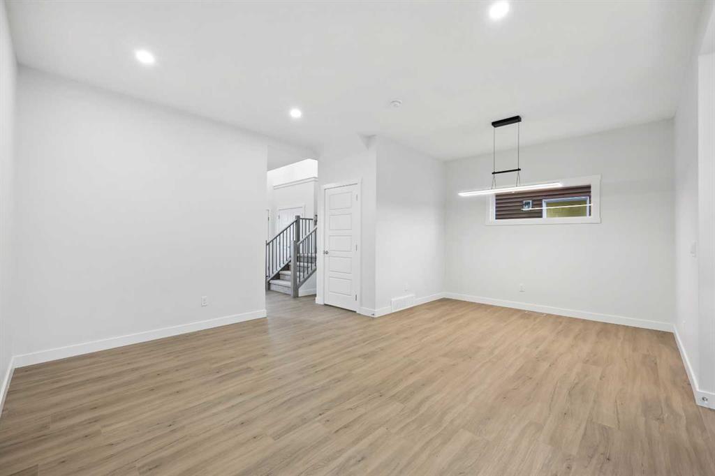 Upstairs, the primary bedroom includes a walk-in closet and ensuite. Two additional bedrooms, a full bathroom, and upper-level laundry complete this floor. Interior finishes include maple-stained railing with nickel spindles, Cozy White luxury vinyl plank, Off Shore carpet, and Micabella LVT. This home includes a side entry with basement rough-ins, a 9’ foundation, and gas lines to the range and BBQ. A gravel parking pad is also included.