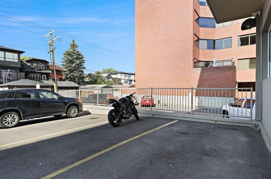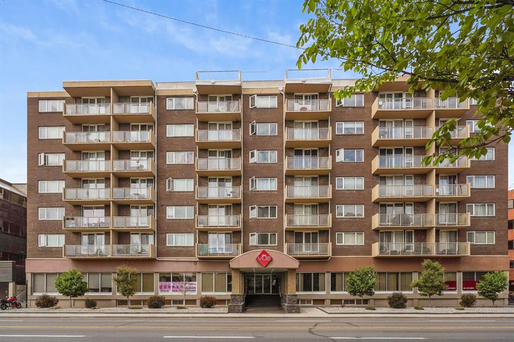 This corner END unit showcases fantastic CITY SKYLINE VIEWS and must be seen. Very close to the downtown core in the heart of Hillhurst, and walking distance to the pubs, restaurants, and shops of Kensington. Stroll to the walking paths along the Bow River, beautiful Riley Park, and the Sunnyside LRT station and even up the hill to SAIT! In a concrete building, this 1-bedroom condo features a kitchen perfect for entertaining with eating bar, stainless steel appliances, granite countertops, mosaic tile backsplash, and darker stained cabinetry, a 5-piece bath with jetted tub and granite counters, cozy living room, IN-SUITE laundry, parking stall (#31) and separate private storage area (#31). The bedroom is separated from the living room and eating area for privacy and quiet. The Vue building offers a fully equipped exercise room with newer equipment and bike storage! The very low condo fee ($436/month) includes heat and water and sewer. Experience the great location, style and convenience of this condo and the Kensington area. Priced to sell.