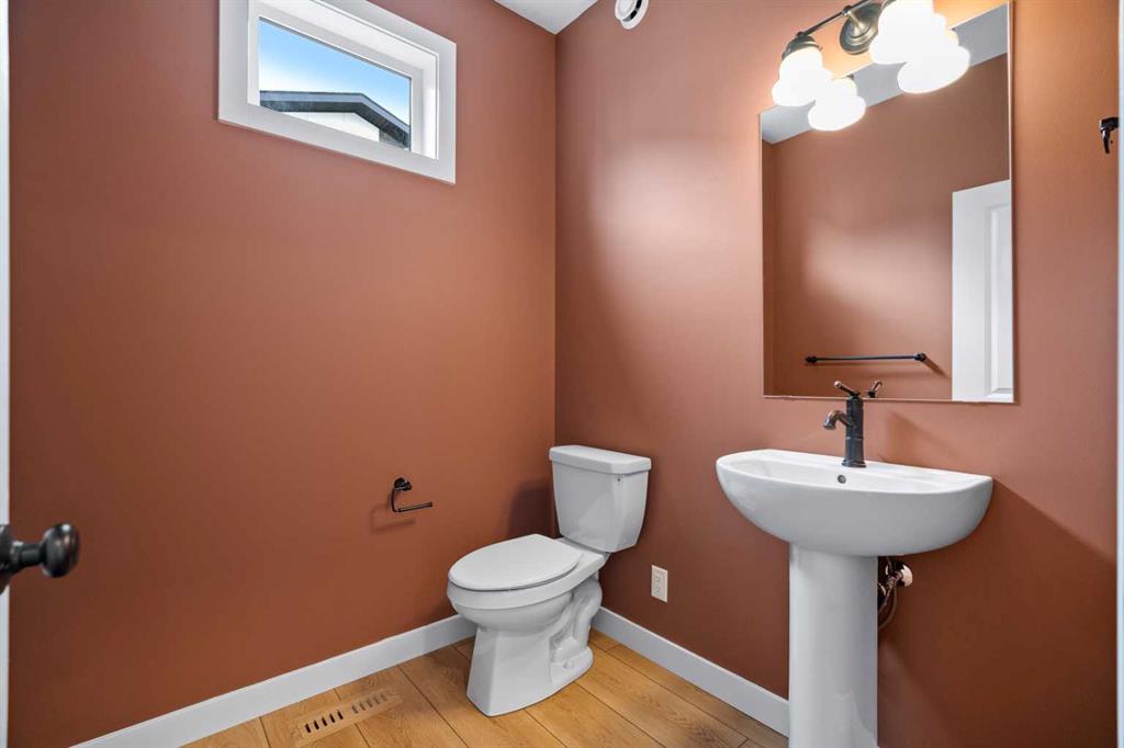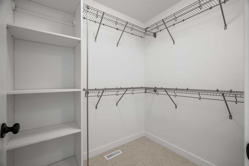 Upstairs, two secondary bedrooms are located at the back of the home—well suited for children, guests, or a quiet workspace. A 3-piece bathroom with under-sink storage adds both convenience and thoughtful design. The primary bedroom creates a relaxing retreat with a large window, oversized walk-in closet with built-in organizers, and a spacious 4-piece ensuite featuring double sinks with quartz countertops, generous cabinet storage, and tiled flooring.