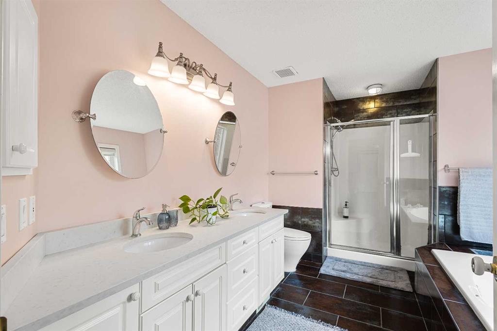 Upstairs, you’ll discover FOUR full bedrooms — a rare find in McKenzie Towne. The primary bedroom is a private retreat with hardwood flooring, double sinks, quartz counters, a jetted soaker tub, and a separate shower. The additional oversized bedroom, complete with its own fireplace and office/study corner, makes for a cozy personal haven, while the other two bedrooms offer plenty of space for family or guests.