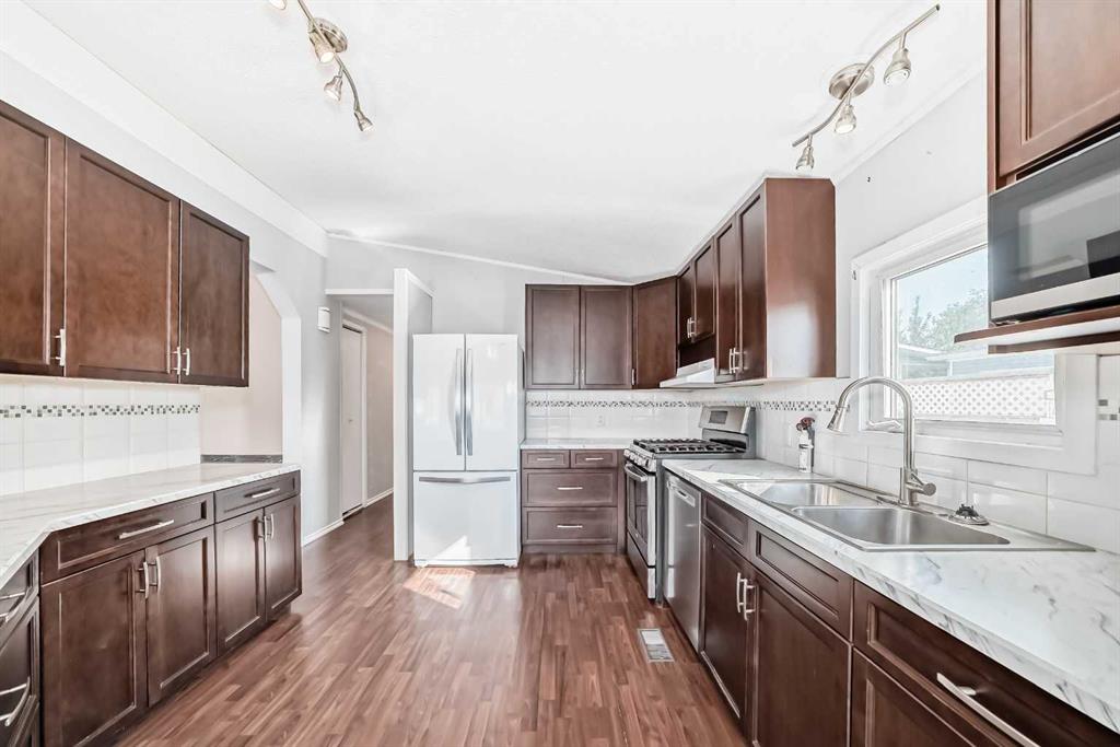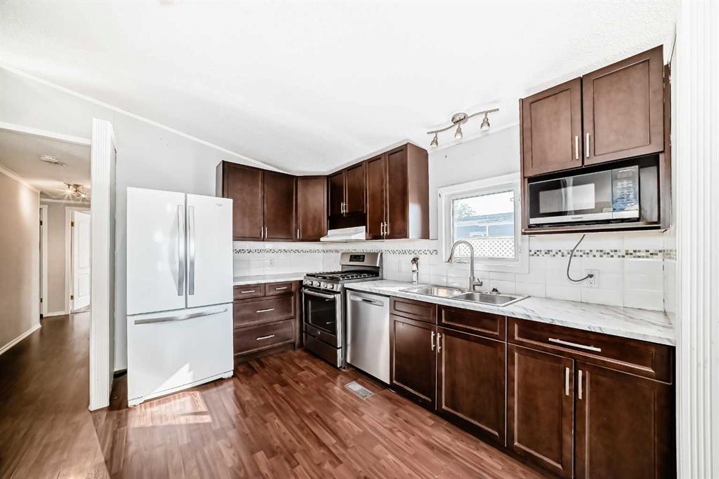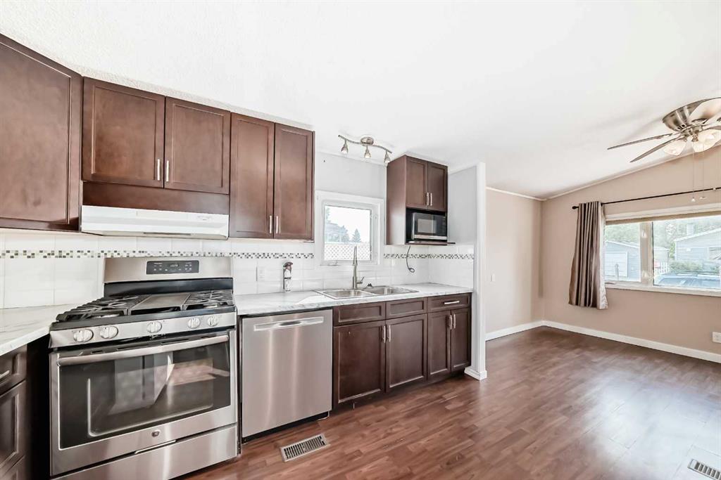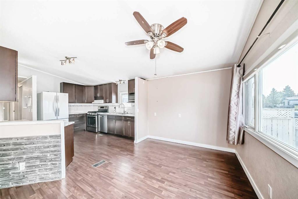 Incredible value awaits in this spacious three-bedroom double-wide mobile home tucked into a quiet neighborhood in Strathmore. The kitchen has been updated with newer appliances, countertops, and cabinets, and flows seamlessly into the dining and living room area. This home comes with many extras including vinyl windows, newer shingles, central air conditioning, a shed, vacuum system with attachments, a newer hot water tank, and a newer washer and dryer.