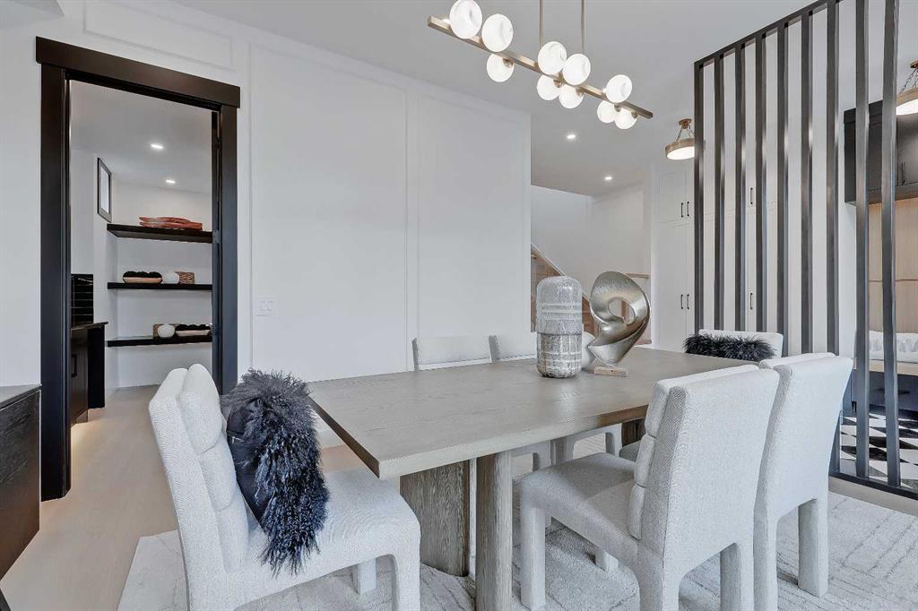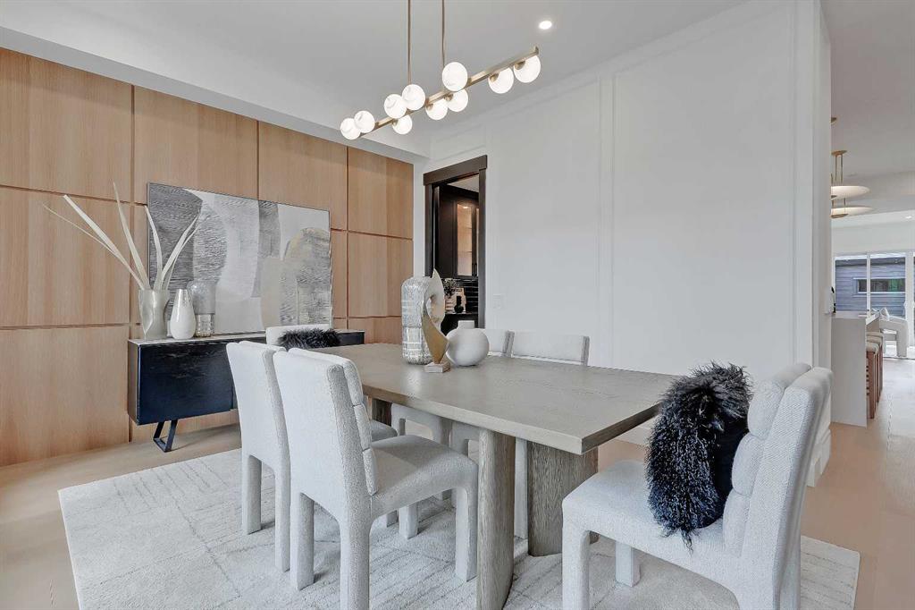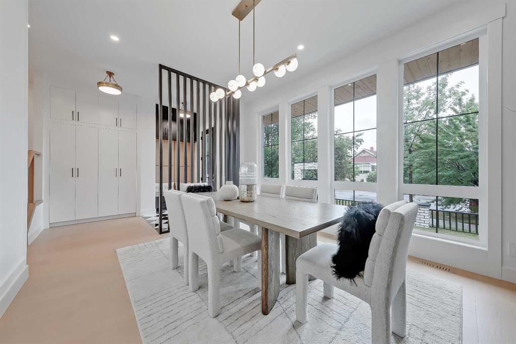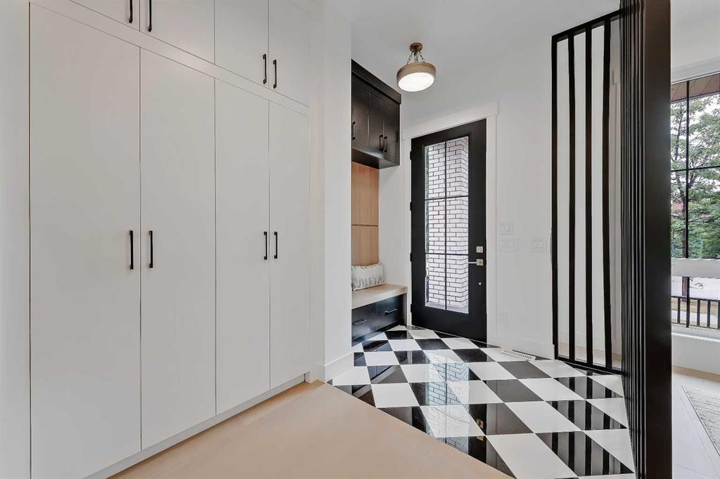 Step inside to an eye-catching front entry featuring checkerboard tile, a built-in bench with cabinetry, and statement slatted millwork that offers subtle separation. Just off the foyer, the formal dining room makes an instant impression with its oak-panelled feature wall and a wall of oversized windows overlooking the treelined street.