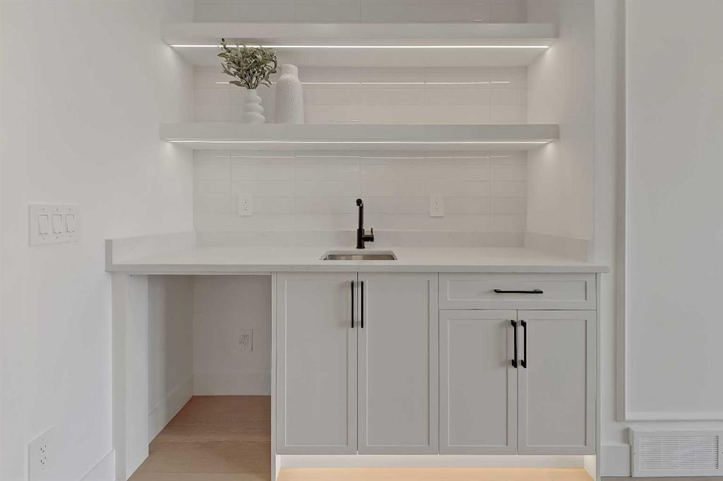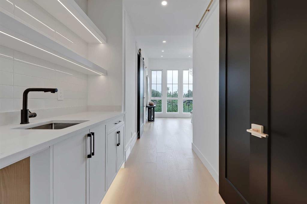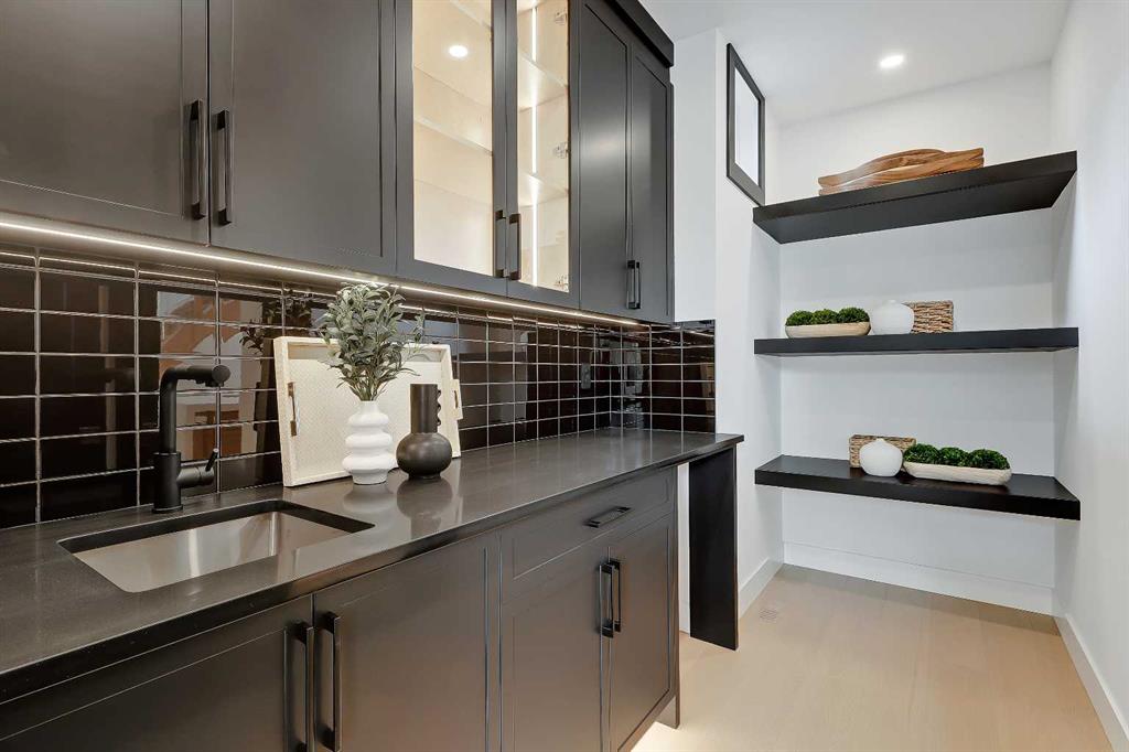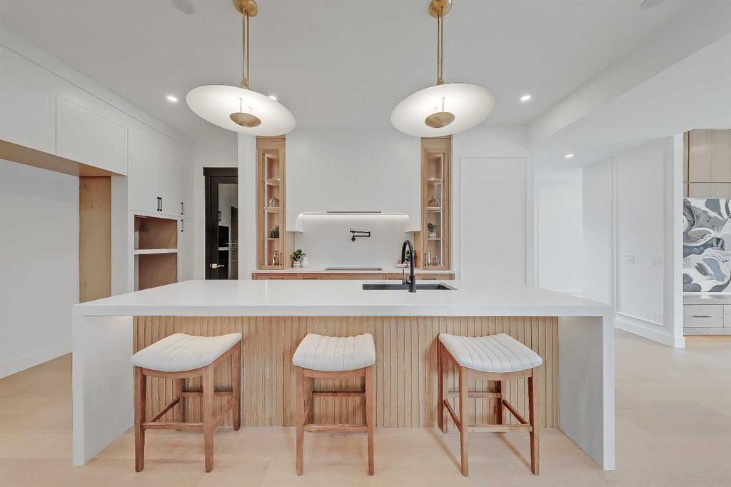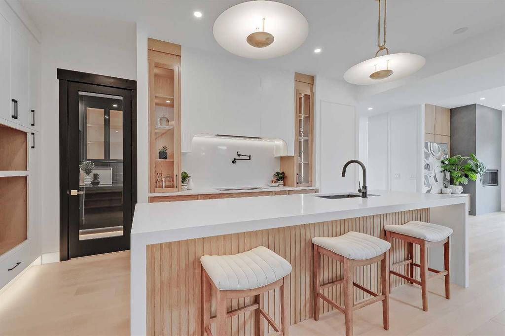 At the heart of the home, the kitchen pairs sculptural design with everyday utility, featuring an arched custom hood fan, quartz countertops, full-height oak and white cabinetry, matte black fixtures, and a pot filler for added convenience. A hidden prep kitchen with additional cabinetry, open shelving, and a sink adds both storage and style with walkthrough access to the dining room.