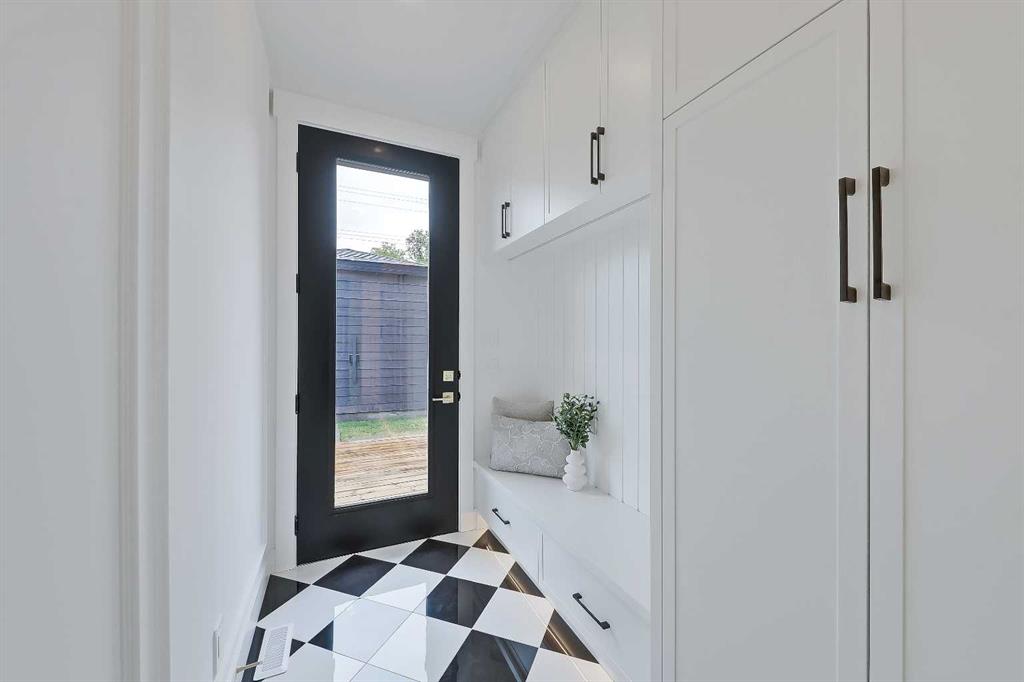 The living room exudes cozy sophistication, anchored by a gas fireplace with a charcoal tile surround and a floating oak media center with feature wall. Full-height sliding doors lead to the backyard, inviting natural light into the space. The stunning checkered tile floor flows across the large rear mudroom with built-in cabinets, and an upscale and bright powder room with black quartz skirted counter rounds off this already incredible main floor.