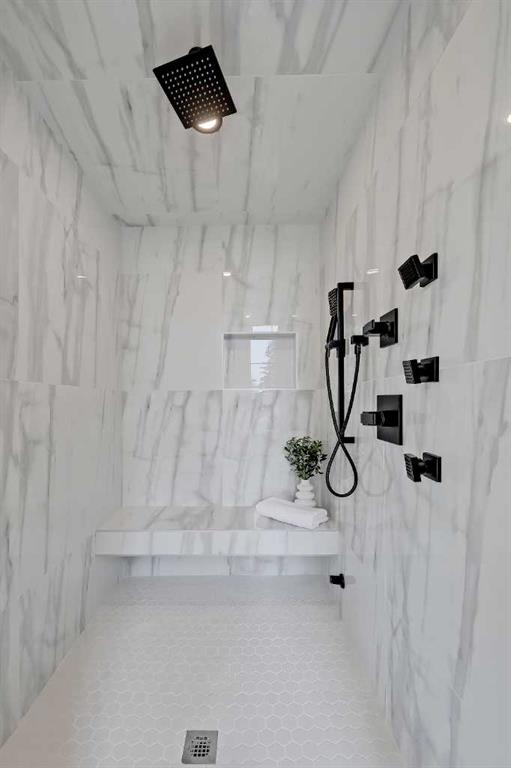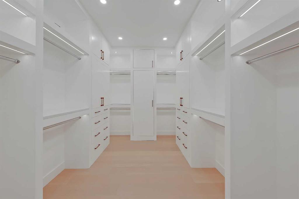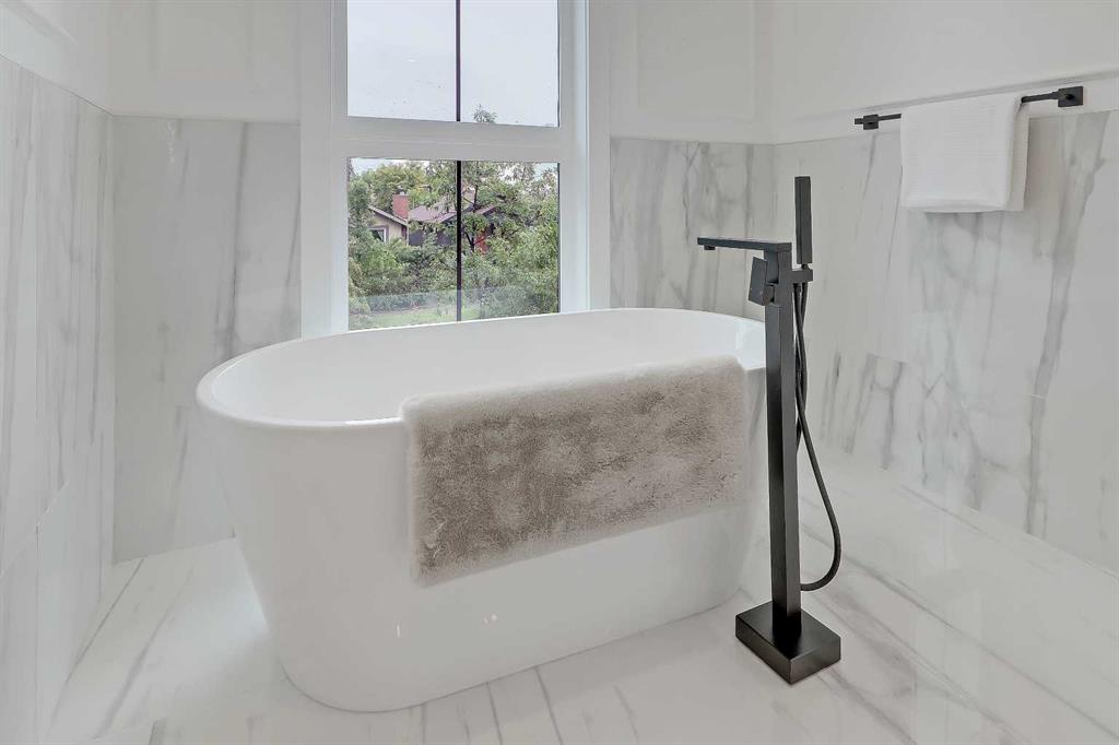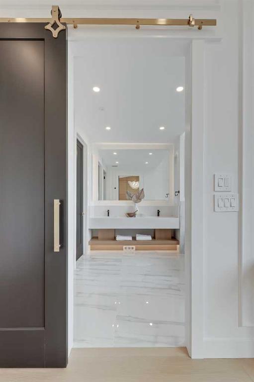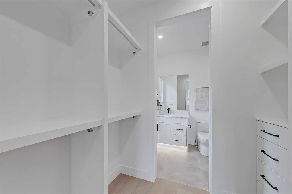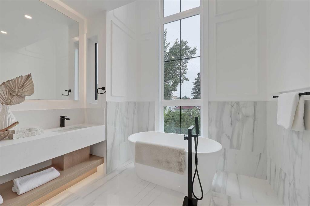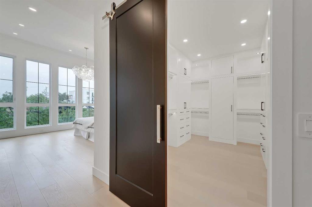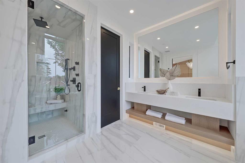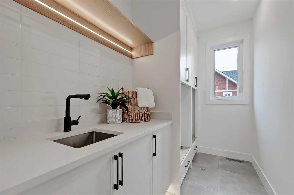Upstairs, a laundry room and three bedrooms each offer something special. The primary suite is an owner’s retreat with a vaulted ceiling, a dream walk-in closet with floor-to-ceiling built-ins, and a spa-like ensuite featuring oversized tile, a freestanding soaker tub with extended vaulted ceiling overhead, dual sinks, and a fully tiled walk-in shower with STEAM. Plus, a built-in coffee bar elevates the space even further, with sink, floating shelves, and space for a bar fridge! Both secondary bedrooms feature tray ceilings with custom shiplap treatment, walk-in closets, and full 4-pc private ensuites.